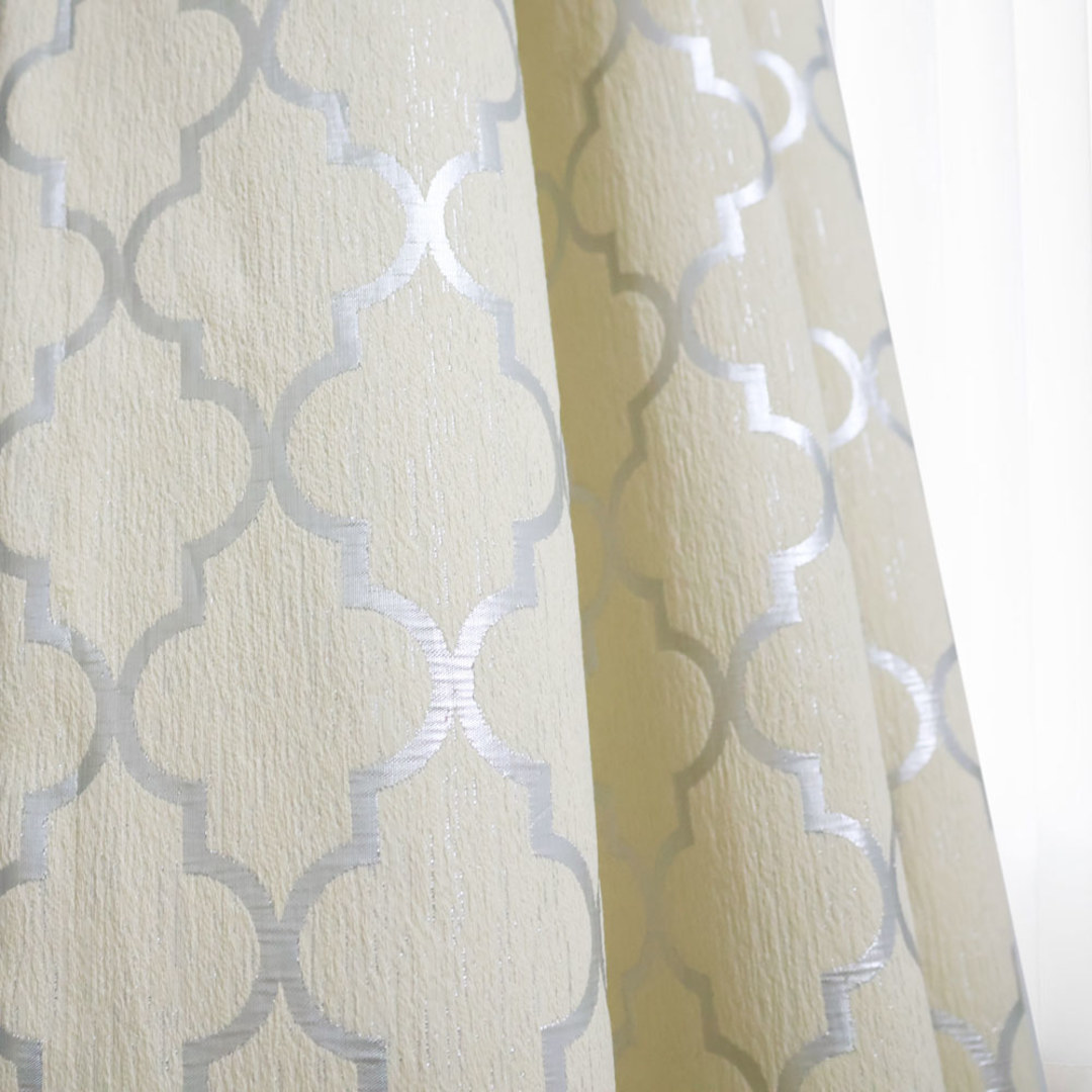 This elegant curtain fabric features a sophisticated arabesque design, showcasing intricate silver-colored, interlocking curves against a textured, light cream background.