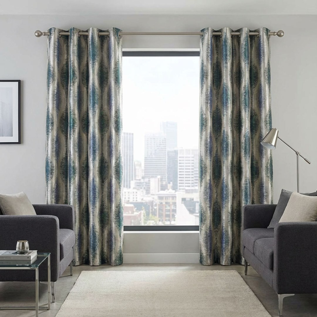 Elevate your space with these jacquard ogee curtains, featuring a subtle geometric Ikat pattern with shimmering metallic accents. They blend contemporary elegance with a hint of boho-chic and exotic flair, perfect for adding texture, pattern, and a luxurious touch to any space.