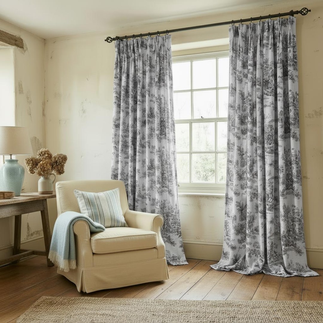 Transform your space with these exquisite Amour Pastorale curtains, crafted from luxurious chenille fabric and featuring a classic French Toile de Jouy design. The intricate pattern depicts romantic 18th-century pastoral scenes, bringing a sophisticated, vintage charm to any room.