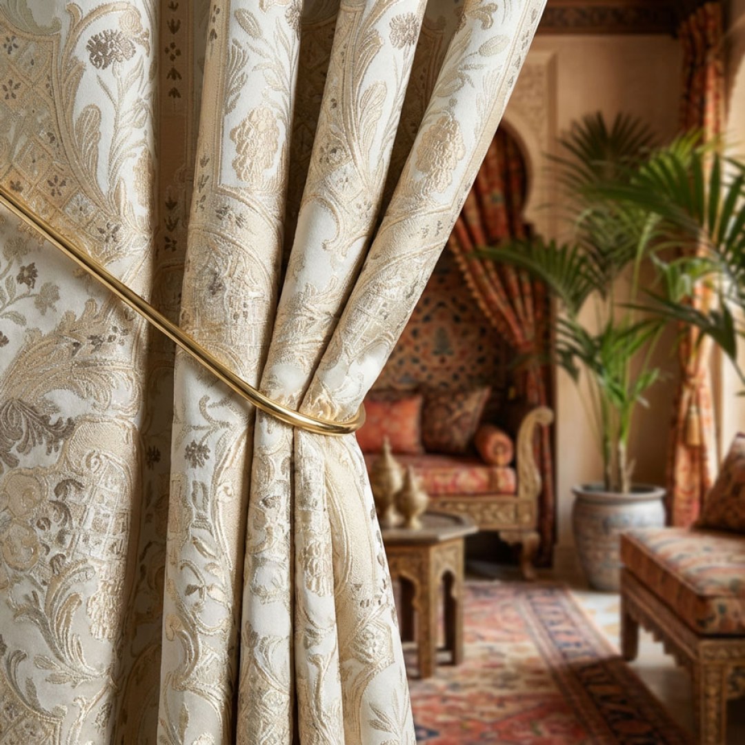 Indulge in timeless opulence with this exquisite jacquard fabric. Intricate golden arabesque vines and floral medallions shimmer with a subtle metallic sheen, creating a palatial glow perfect for elegant living rooms, dining rooms, and grand bedrooms. Rich texture, soft drape, and sophisticated neutral tones that elevate any interior to royal status.