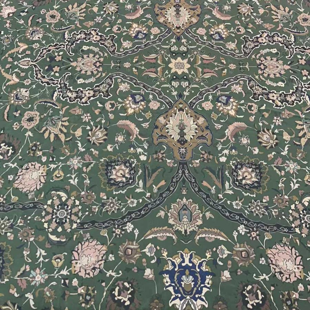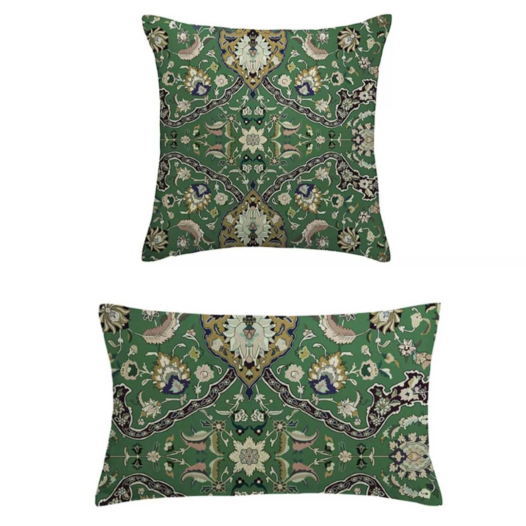 Zanjan Zen evokes the serene elegance of Persian artistry with a modern twist. Set against a rich, botanical green velvet backdrop, its intricate floral and ornamental motifs bloom in soft neutrals, dusty rose, and deep indigo.