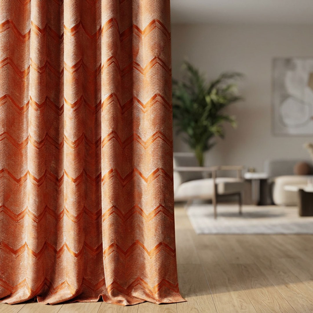 These curtains feature a bold geometric chevron pattern on luxurious faux silk with a subtle sheen. Perfect for contemporary interiors, their timeless design adds depth and sophistication to any space.