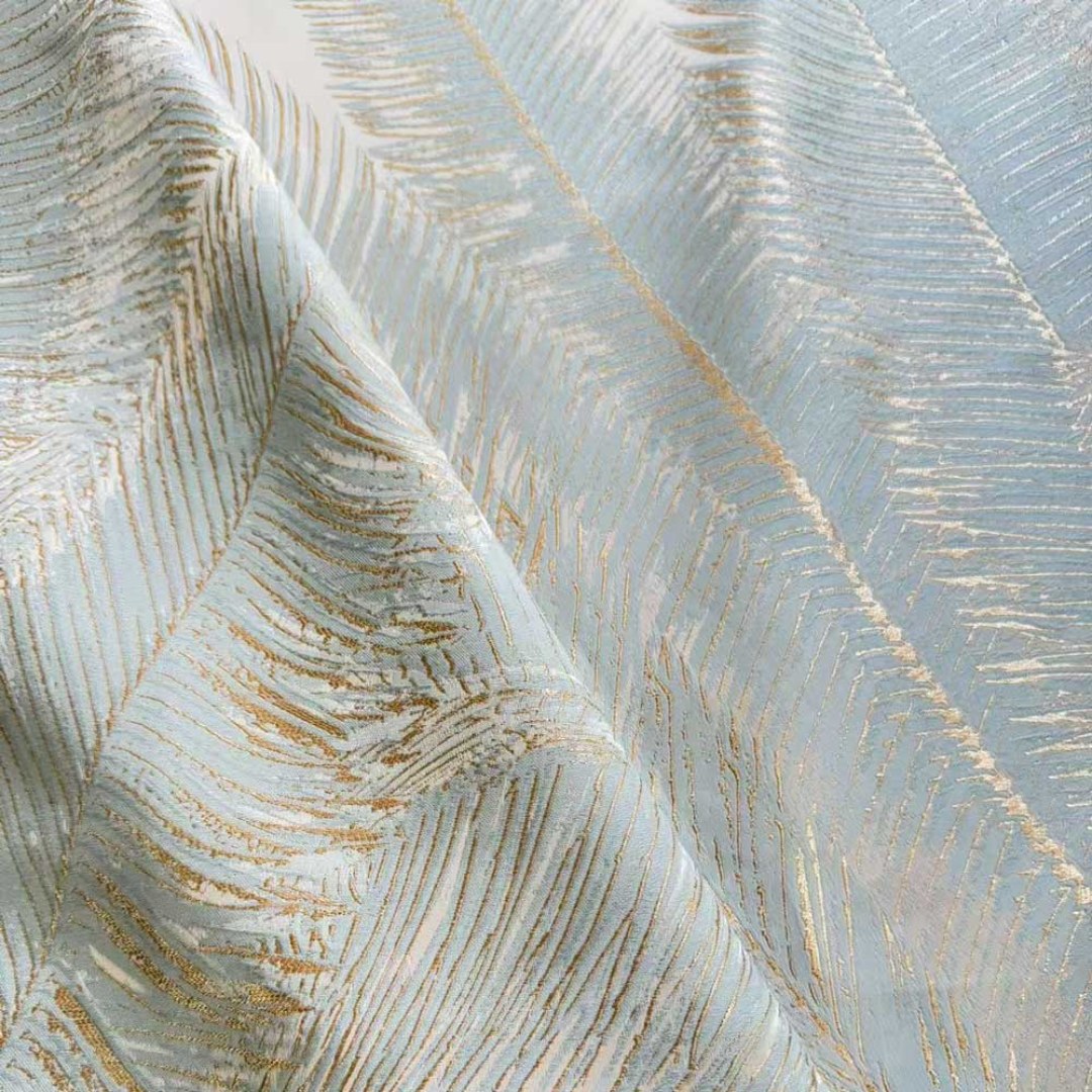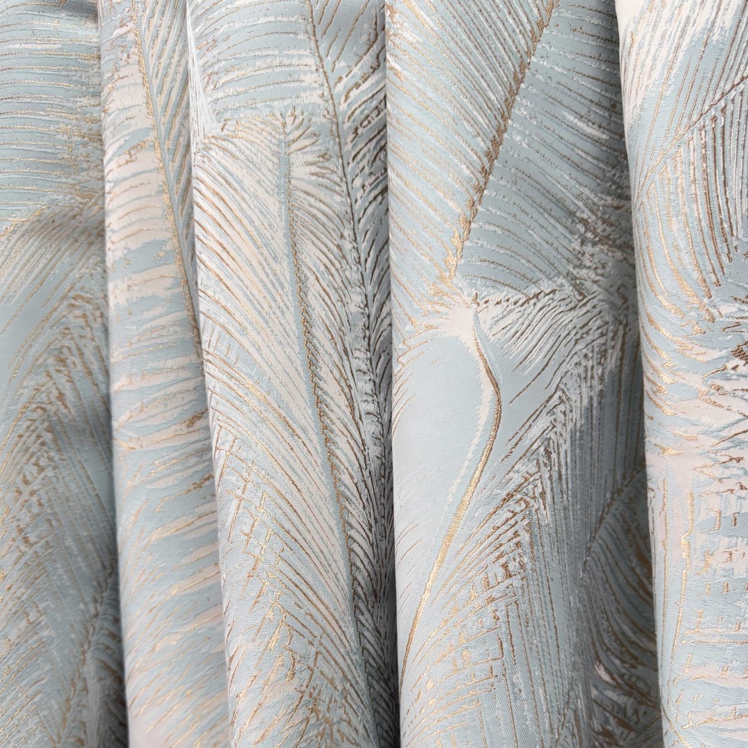 These jacquard curtains showcase a tropical palm pattern in soft pastel blue with subtle gold accents. The textured weaving adds depth, while the modern color palette and organic motif create a fresh, contemporary look, perfect for bringing elegance and visual interest to any interior.