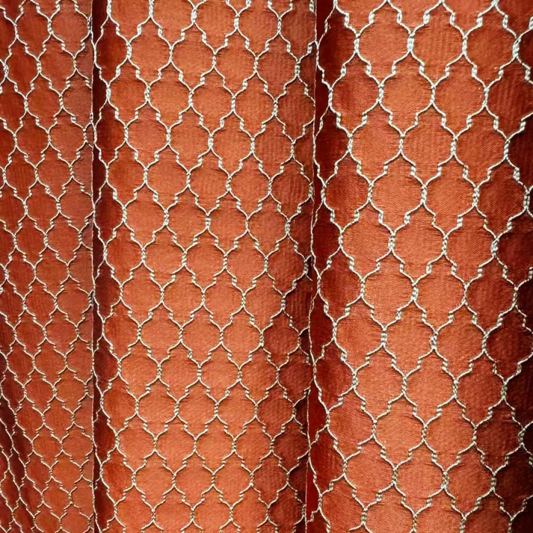 This luxurious curtain fabric showcases an intricate arabesque pattern, with elegant gold accents weaving through a textured design.