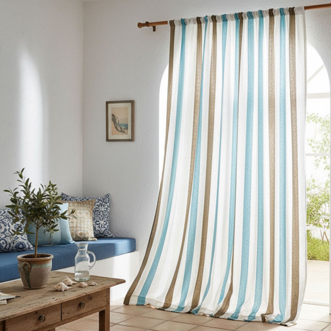 A bold striped cotton-blend curtain in turquoise, brown, and white, inspired by the breezy elegance of Mediterranean living. Its fresh, graphic design also suits contemporary spaces, bringing a vibrant yet relaxed atmosphere to any room.