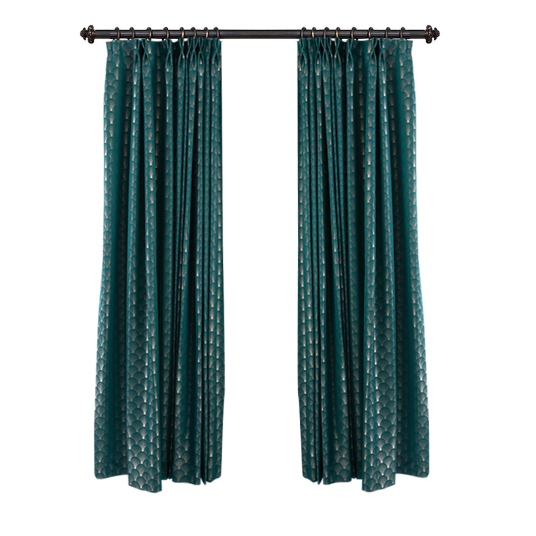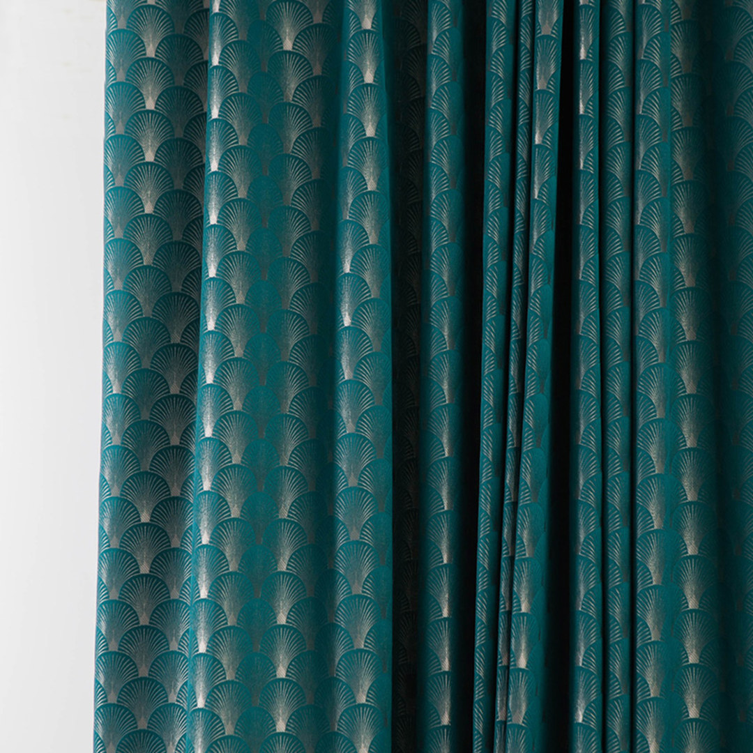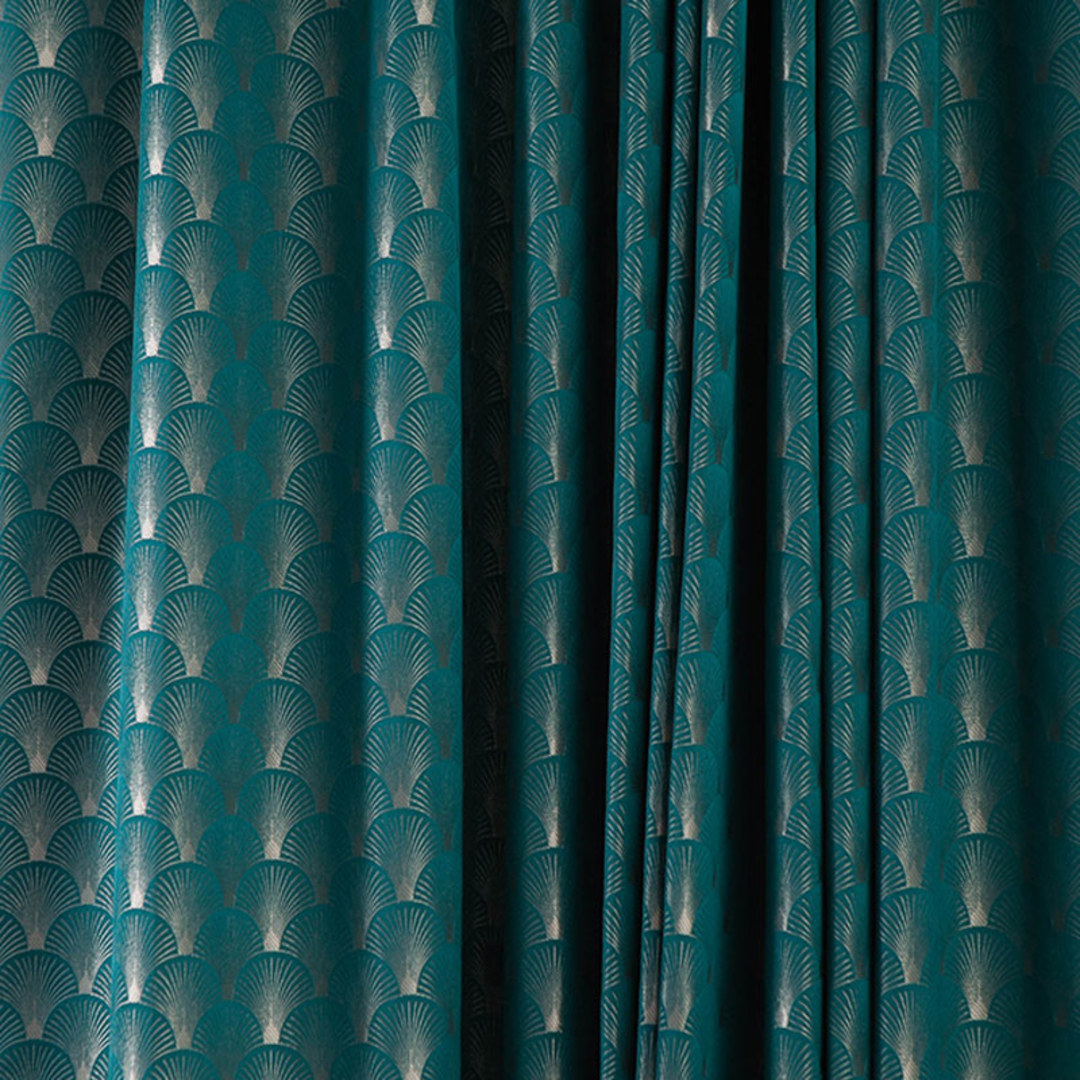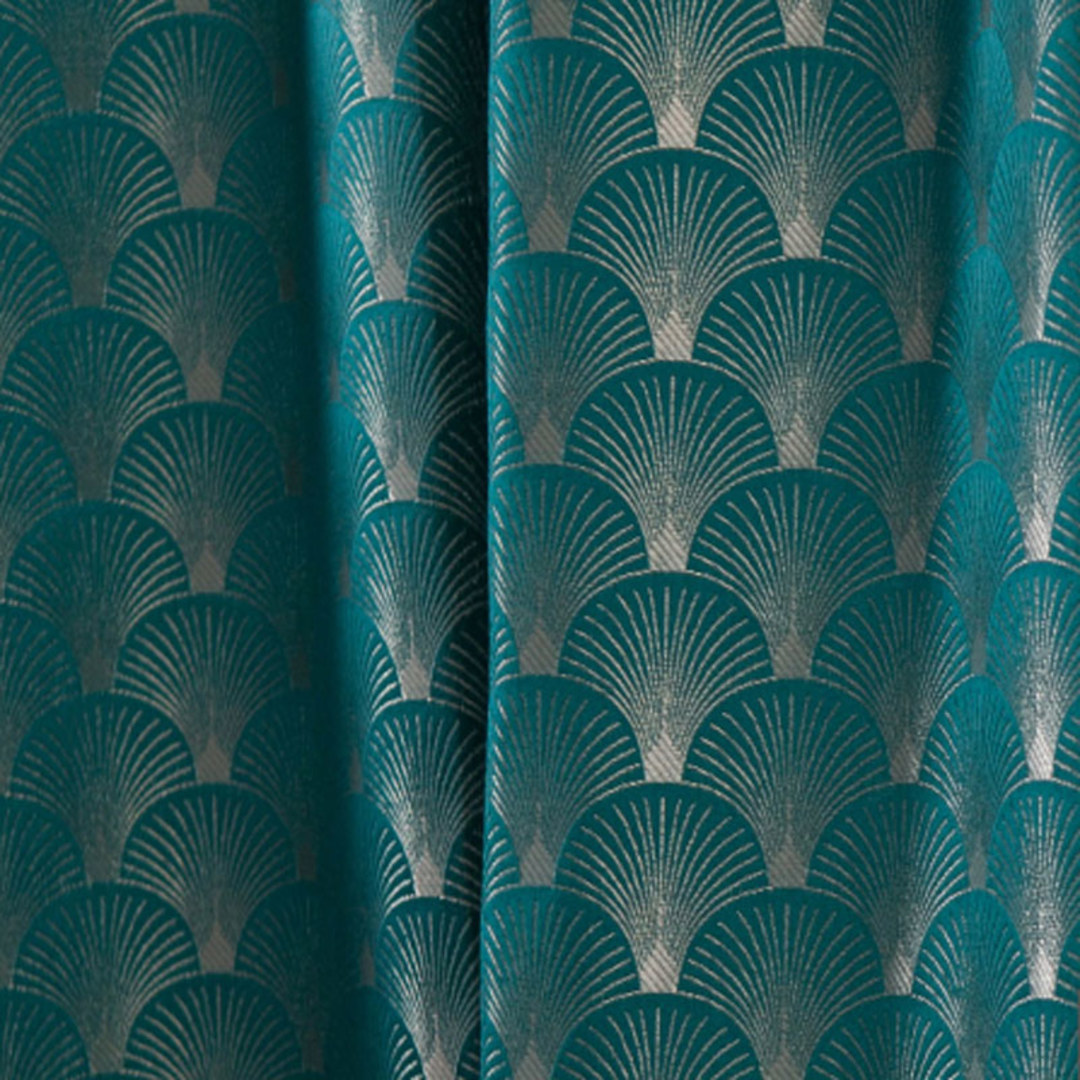 Ces classiques rideaux Art Déco à motifs coquillages turquoise et argent compléteront n'importe quelle pièce de votre choix et constitueront un élément décoratif audacieux.