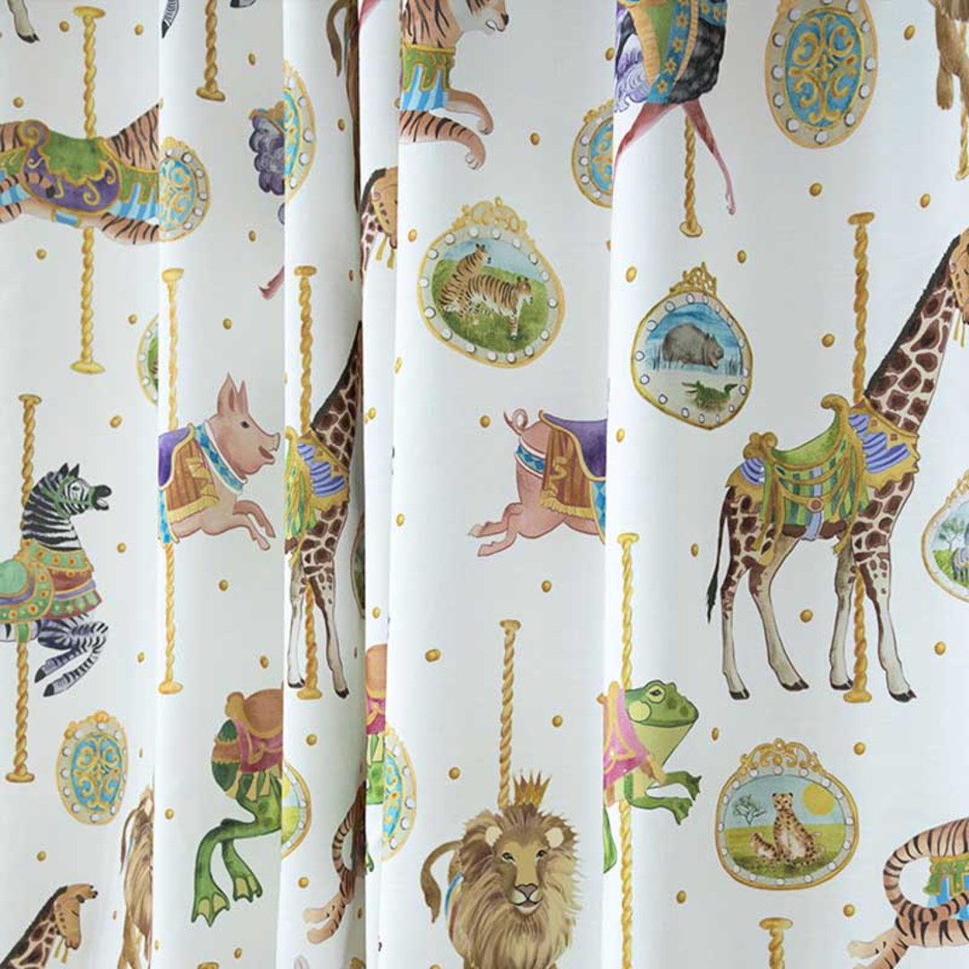 Manège magique avec girafe, lion, tigre, lapin, autruche, grenouille, zèbre et cochon ! Ces rideaux à motifs animaux mignons et ravissants sont le complément idéal pour la chambre ou la salle de jeux de vos enfants. Nos rideaux sur mesure sont créés selon vos exigences exactes et sont disponibles dans un choix de styles de tête : œillets, patte de fixation, plissé simple, plissé double, plissé à triple ourlet ou rideaux à vagues. Commandez des embrasses et des coussins assortis pour améliorer l'ensemble de l'environnement.Découvrez davantage de nos amusants rideaux pour enfants.