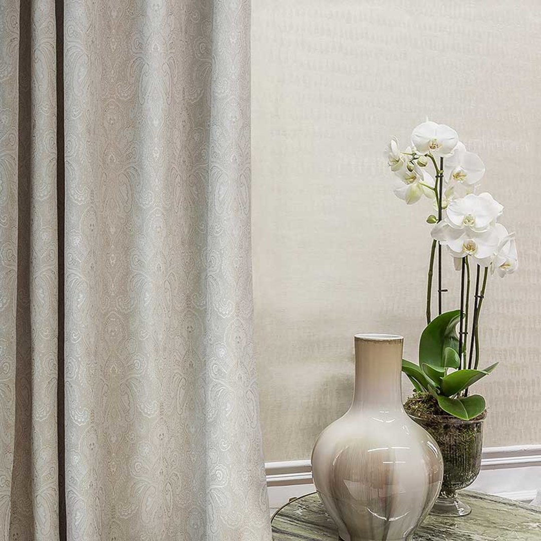 NOTE: Motif non-railroadé qui suit le sens du rouleau, parallèle à la bordure. L'orientation du motif vous permettra de réaliser un rideau de n'importe quelle longueur sans ajouter de coutures horizontales.