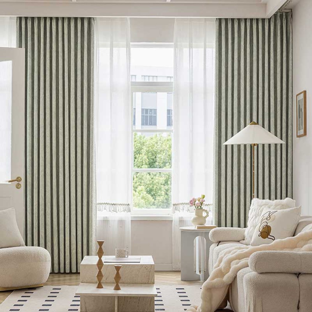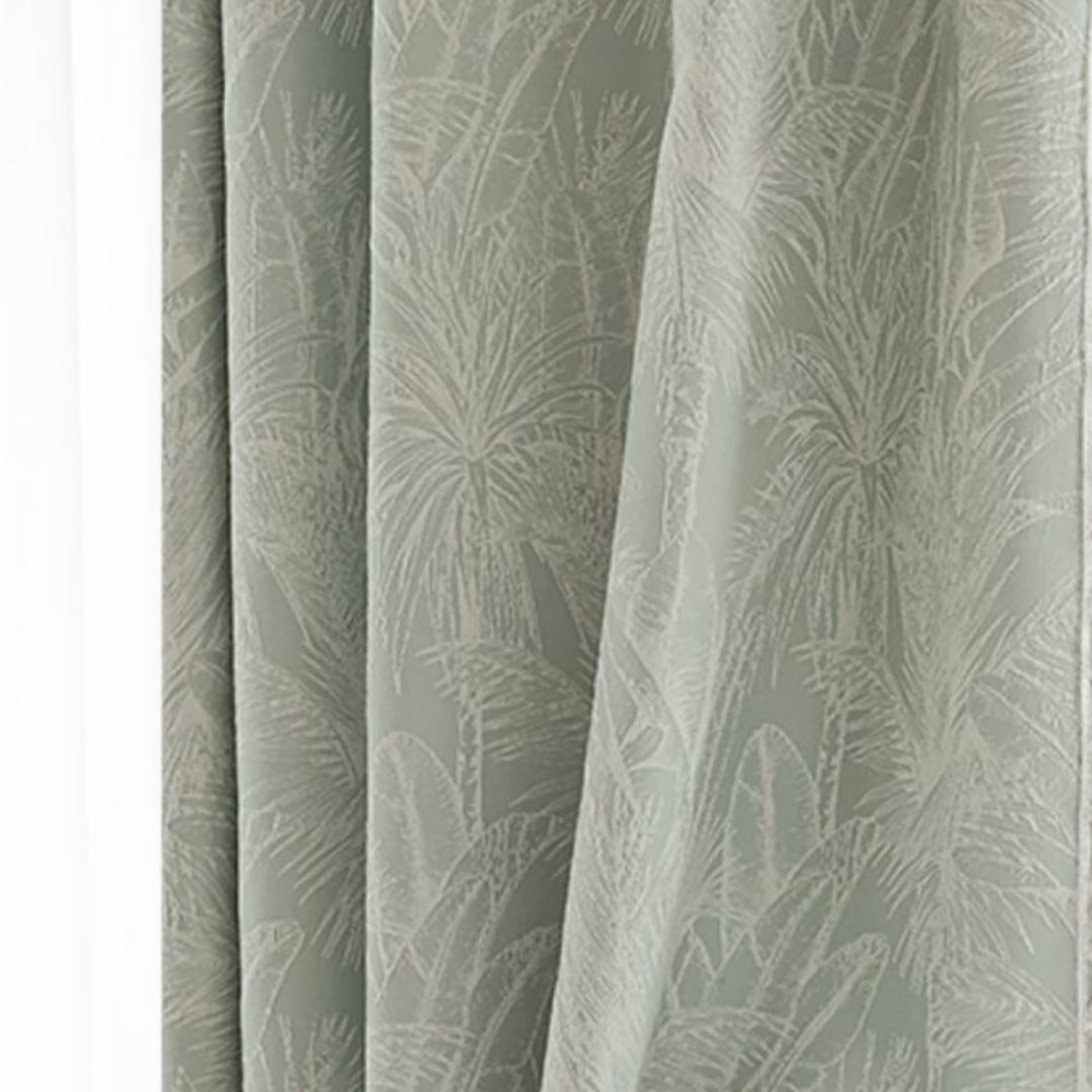 This chenille curtain fabric features a subtle tropical-inspired design with palm fronds and leaves woven into a textured jacquard pattern. The soft green tone is complemented by a raised white design, creating a sophisticated and calming look suitable for a variety of interior styles. The fabric is durable, making it ideal for window treatments, adding both style and a touch of nature to any space.Our made to measure curtains are meticulously crafted to meet your specific preferences. They come in a variety of heading styles to suit your taste, including pencil pleat, eyelet, pinch pleat, tailored pleat, inverted box pleat, tab top, back tab, rod pocket, wave and door window curtains.Explore how Tropical Curtains can update any room.