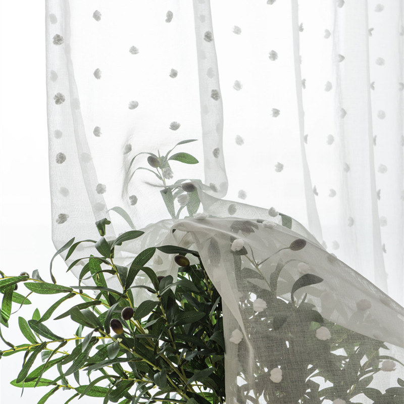 This beautiful fluffy pom pom style white polka dot sheer voile curtain allow daylight to filter through while creating the privacy for your home, make it perfect for lving room french door curtains and sliding glass door curtains.The intricating patterns and 3D textures create an elegant and classic space without losing the minimal aesthetic.Our made to measure curtains are meticulously crafted to meet your specific preferences. They come in a variety of heading styles to suit your taste, including pencil pleat, eyelet, pinch pleat, tailored pleat, inverted box pleat, tab top, back tab, rod pocket, and wave curtain.Explore how dotted voile curtains can update any room.