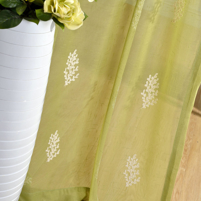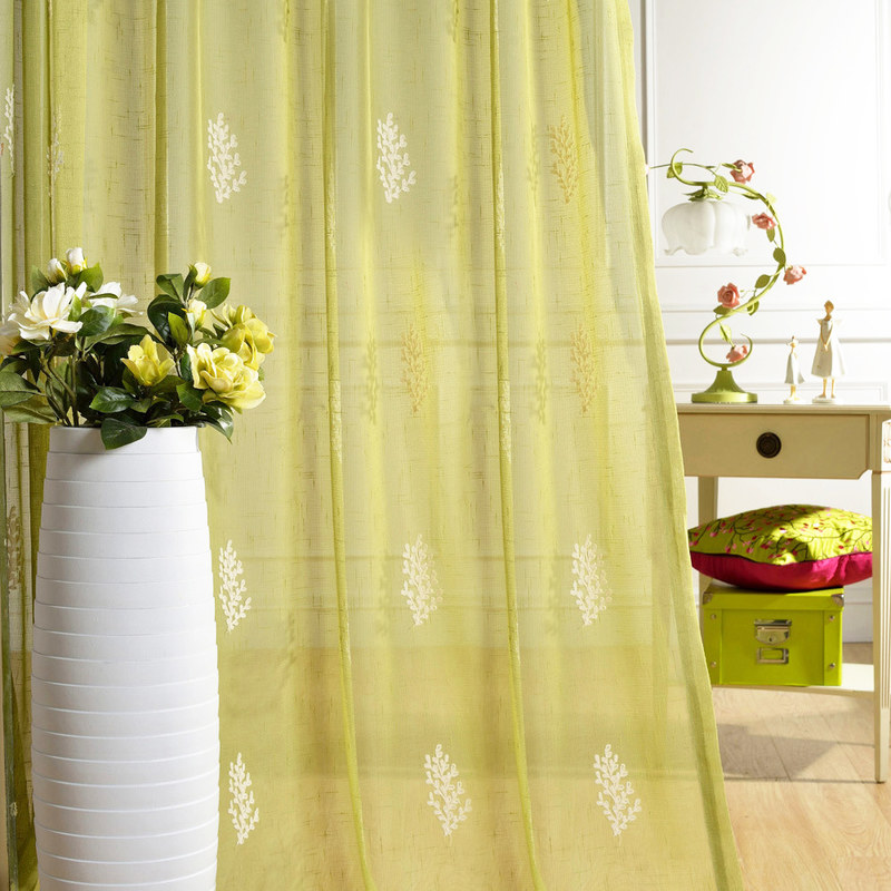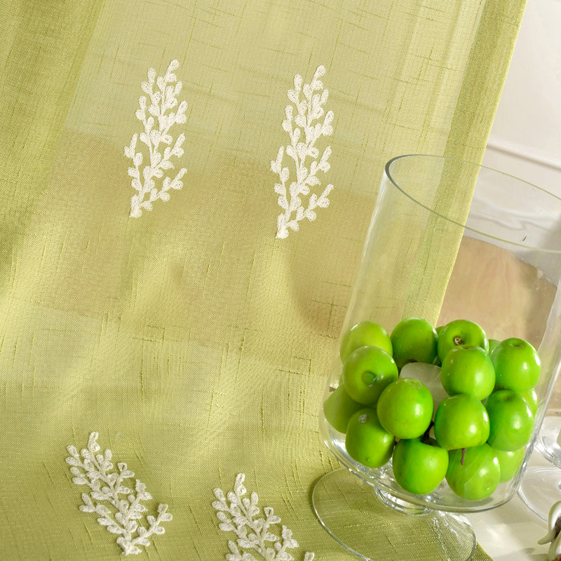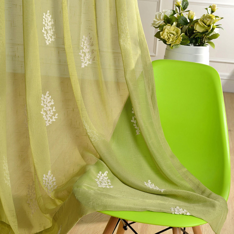 Trees of the Four Seasons collection de rideaux en voile vert chartreuse brodé est fabriquée sur mesure selon vos dimensions exactes et disponible avec différents styles de tête : œillets, pattes de fixation, plissé simple, plissé double, plissé triple, vague, ou rideaux à coulisse.