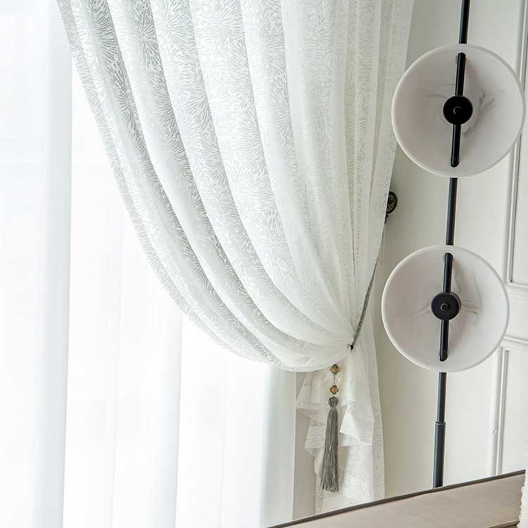 Ces rideaux en dentelle et voile uniques présentent des motifs et des textures complexes qui créent un espace élégant et classique sans sacrifier l’esthétique minimaliste.