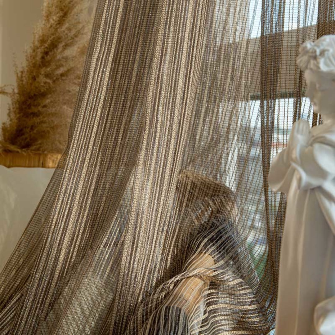 Un fin tissu en maille ajourée et légère, avec un détail de bande verticale à paillettes argentées, idéal pour des rideaux aériens qui laissent passer la lumière et l'air, parfaits pour les rideaux de portes-fenêtres et les rideaux de portes coulissantes. Nos rideaux sur mesure sont méticuleusement confectionnés pour répondre à vos préférences spécifiques. Ils sont disponibles dans une variété de styles de plis pour s'adapter à vos goûts, notamment le galon plissé, à œillets, le plis pincé, le plis tailleur, le plis boîte inversé, à patte, à coulisse cachée, à poche à tringle, vague et rideaux pour portes-fenêtres. Découvrez comment les rideaux à paillettes/scintillants peuvent moderniser n'importe quelle pièce.