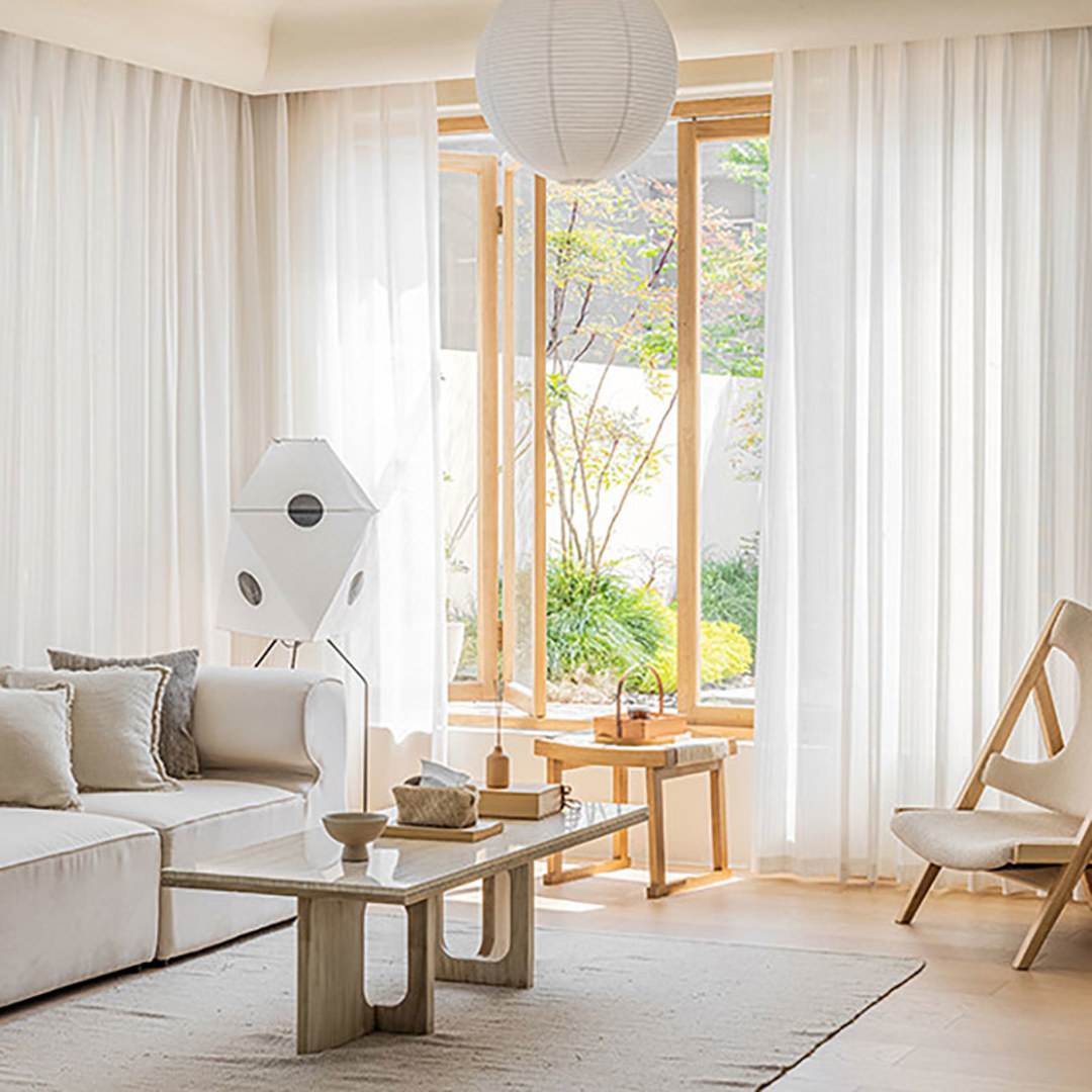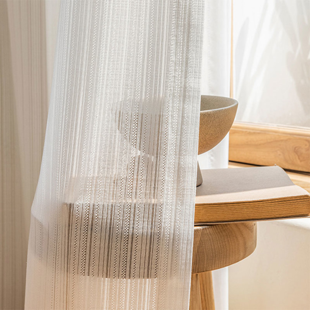 Ces rideaux voilés rayés, épais et semi-transparents, utilisent un procédé de tissage fin spécial qui forme une surface réfléchissante et brillante à l’arrière du tissu, comme un miroir, reflétant la lumière et protégeant l’intimité.