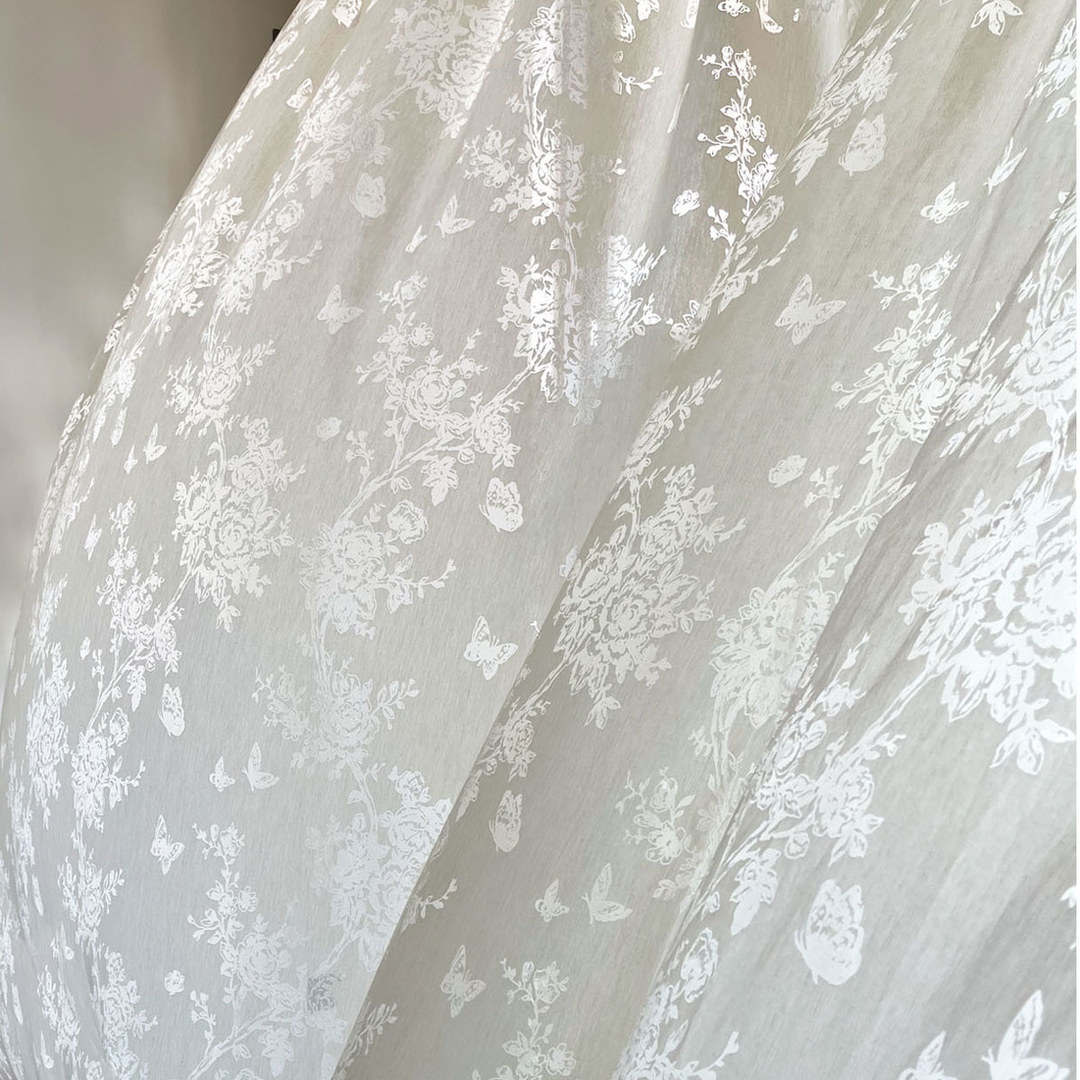Ce tissu voilé unique présente un élégant motif floral avec des détails complexes de roses, de branches et de papillons. Le tissu semi-transparent filtre délicatement la lumière tout en ajoutant une touche florale gracieuse, idéale pour les intérieurs classiques et aérés.