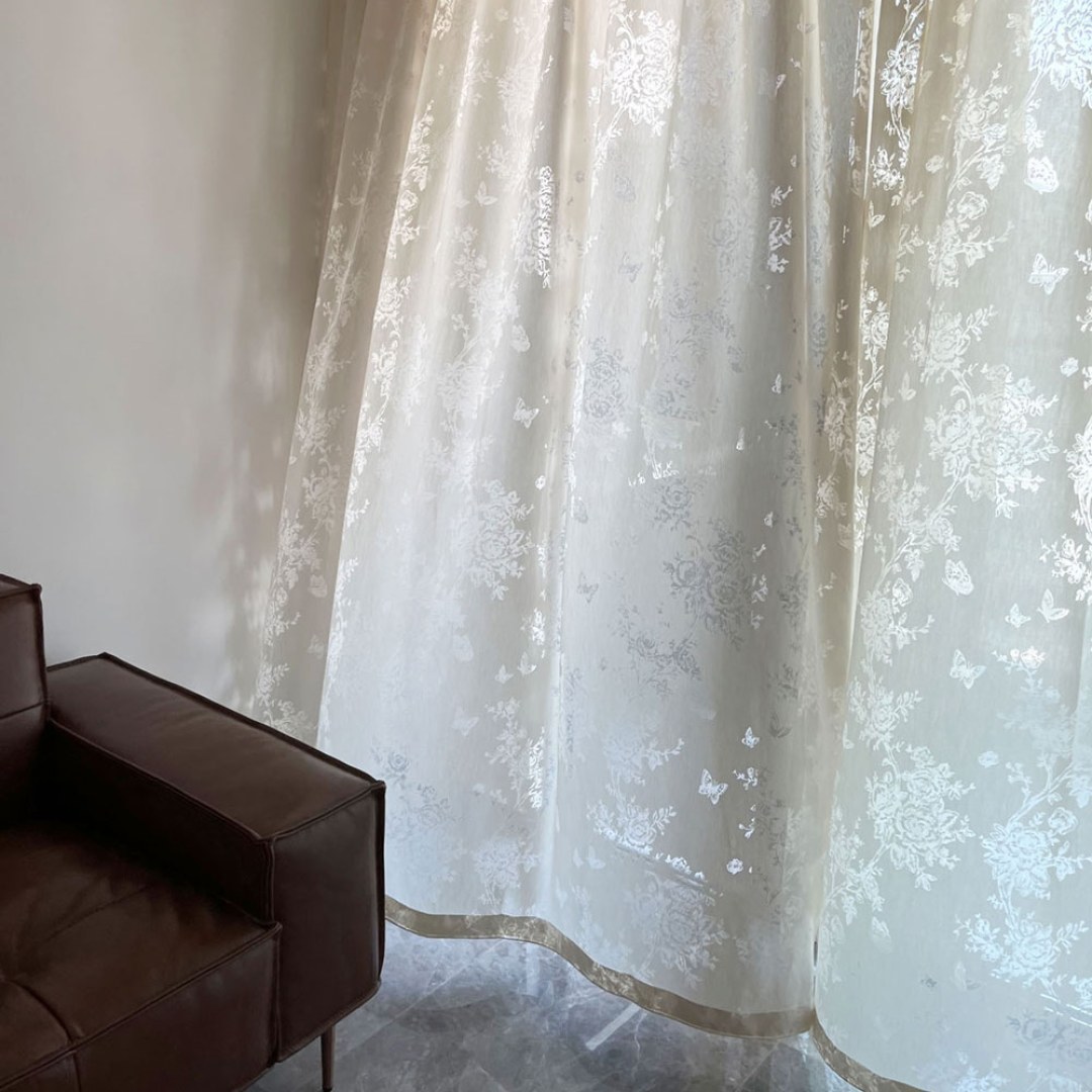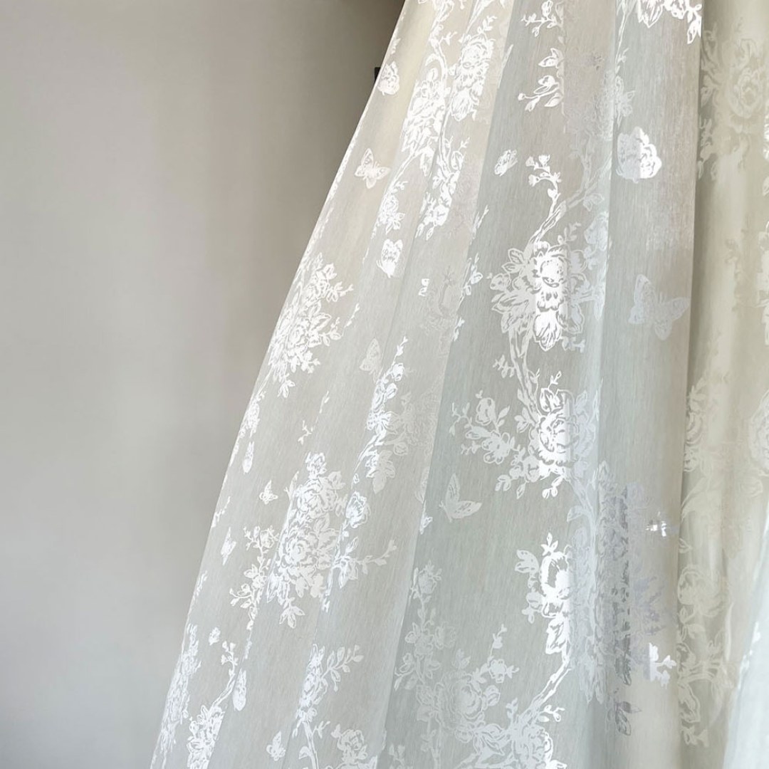 Ce tissu de rideau voilé présente un élégant motif floral avec des détails complexes de roses, de branches et de papillons.