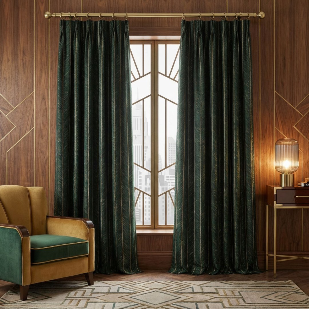 New Look Luxury Art Deco Herringbone Dark Green & Gold Sparkle Geometric Curtain 20% OFF