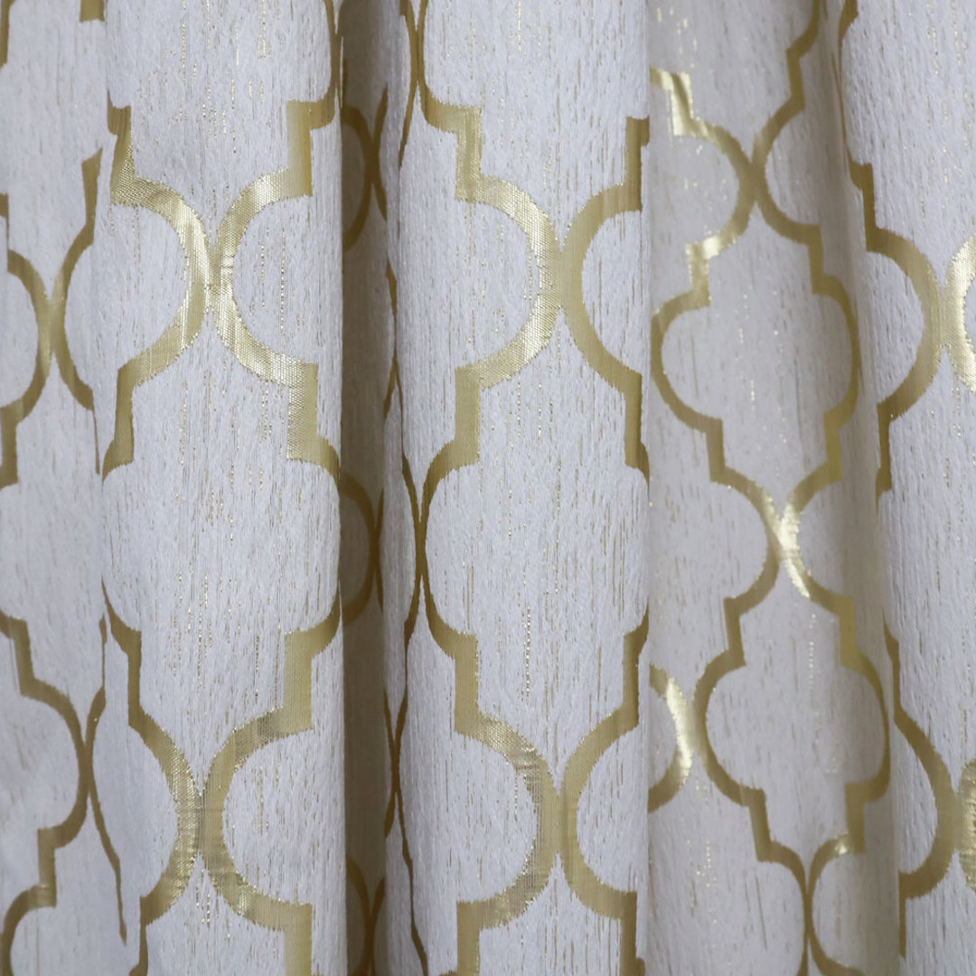 This elegant curtain fabric features a sophisticated arabesque design, showcasing intricate gold-colored, interlocking curves against a textured, light cream background.