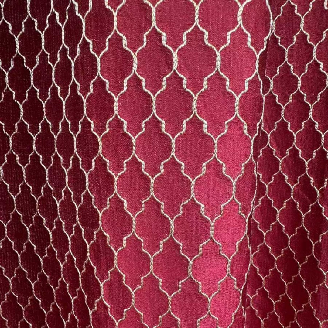 This luxurious curtain fabric showcases an intricate arabesque pattern, with elegant gold accents weaving through a textured design.