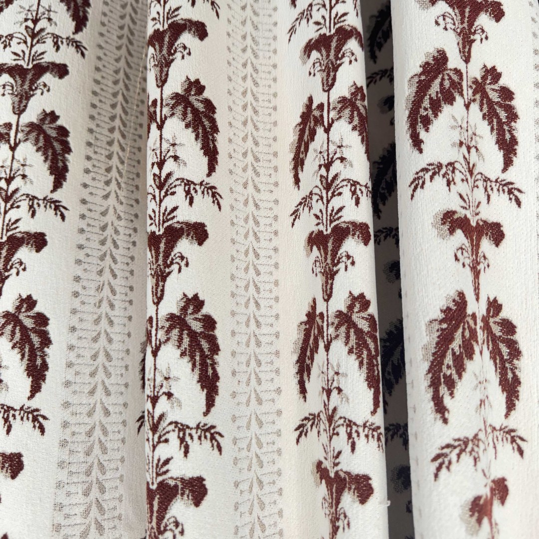 Classic elegance meets cozy texture in Heirloom Stripe. This richly woven heavy chenille fabric features a vertical botanical motif with timeless charm. Its substantial weight provides excellent drape and light filtering, perfect for creating a refined, traditional look in any room.