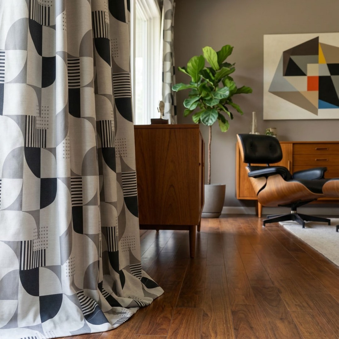 Retro Rhythm Mid Century Modern Black White and Gey Geometric Curtain