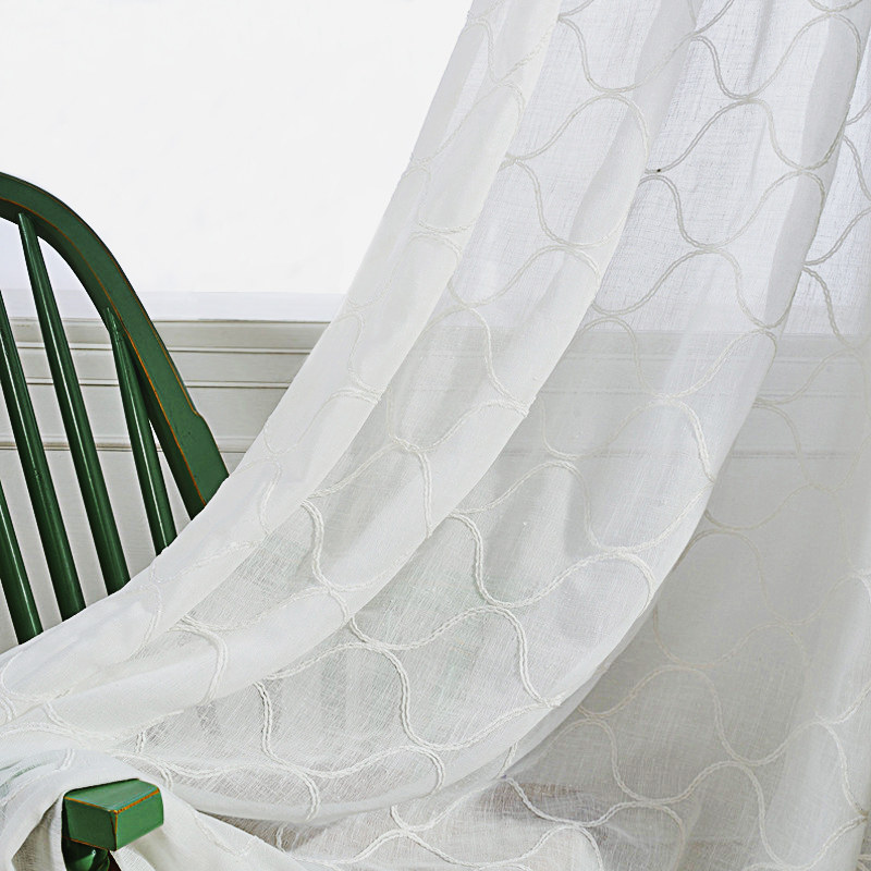 This voile curtain features a delicate embroidered arabesque trellis pattern with a soft, fluffy, plush texture, adding depth and tactile interest to a soft, ivory base with a natural linen look.