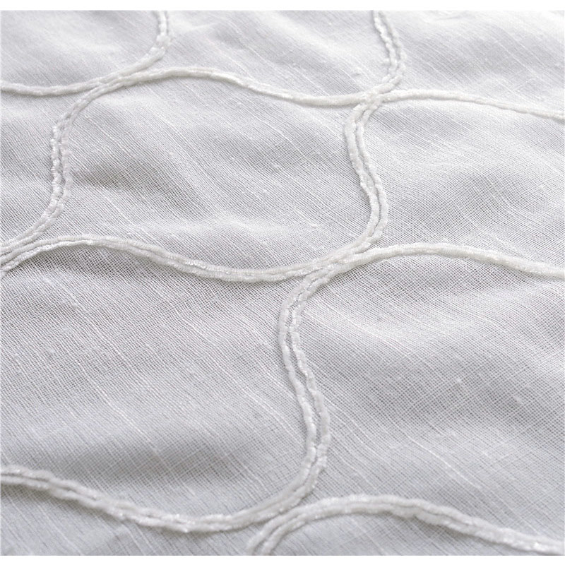 This voile curtain features a delicate embroidered arabesque trellis pattern with a soft, fluffy, plush texture, adding depth and tactile interest to a soft, ivory base with a natural linen look.