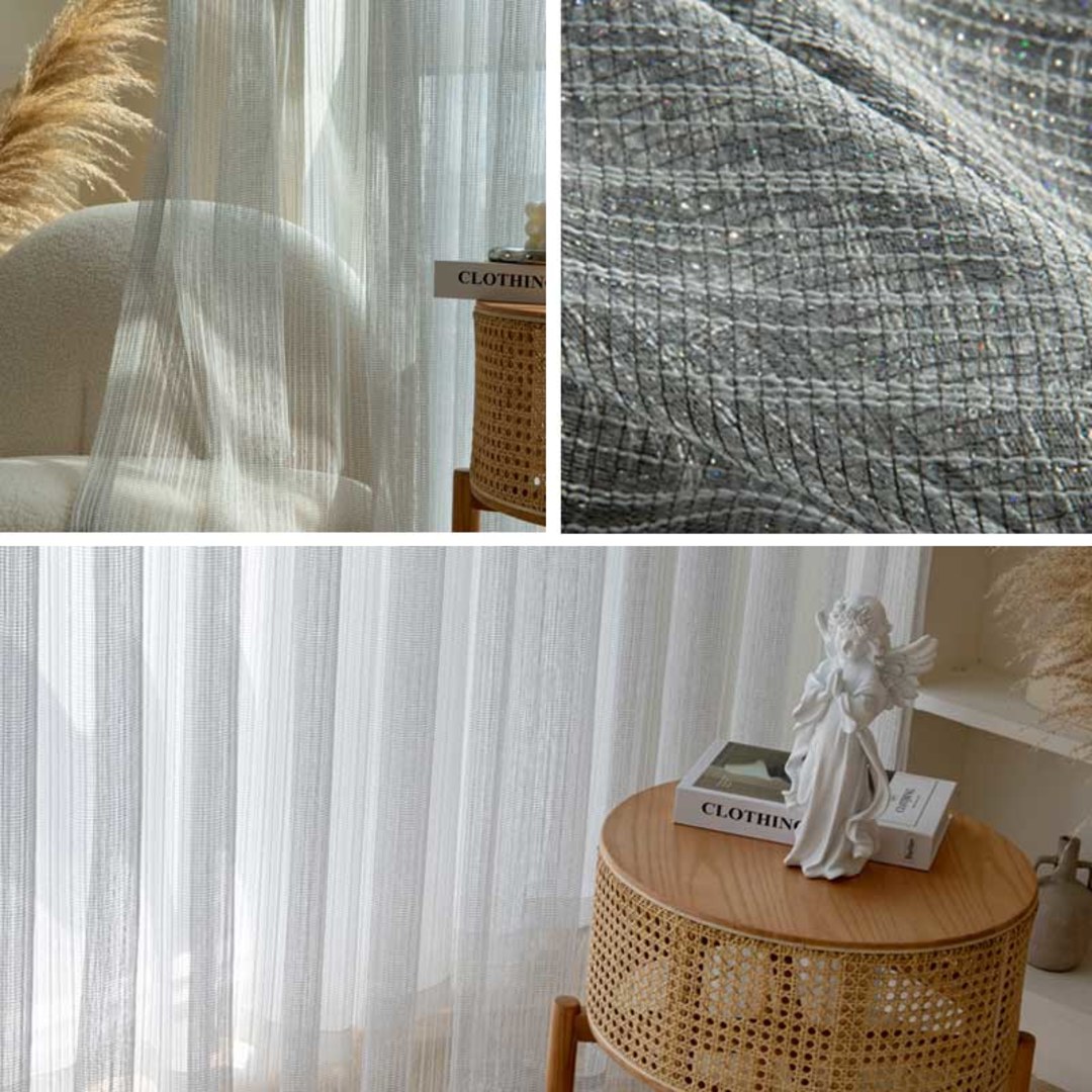 These delicate mesh sheers feature subtle vertical glitter stripes, bringing a refined sparkle to any room. Light and airy, they softly filter sunlight while adding modern elegance and visual interest, making them a versatile choice for a variety of contemporary interiors.