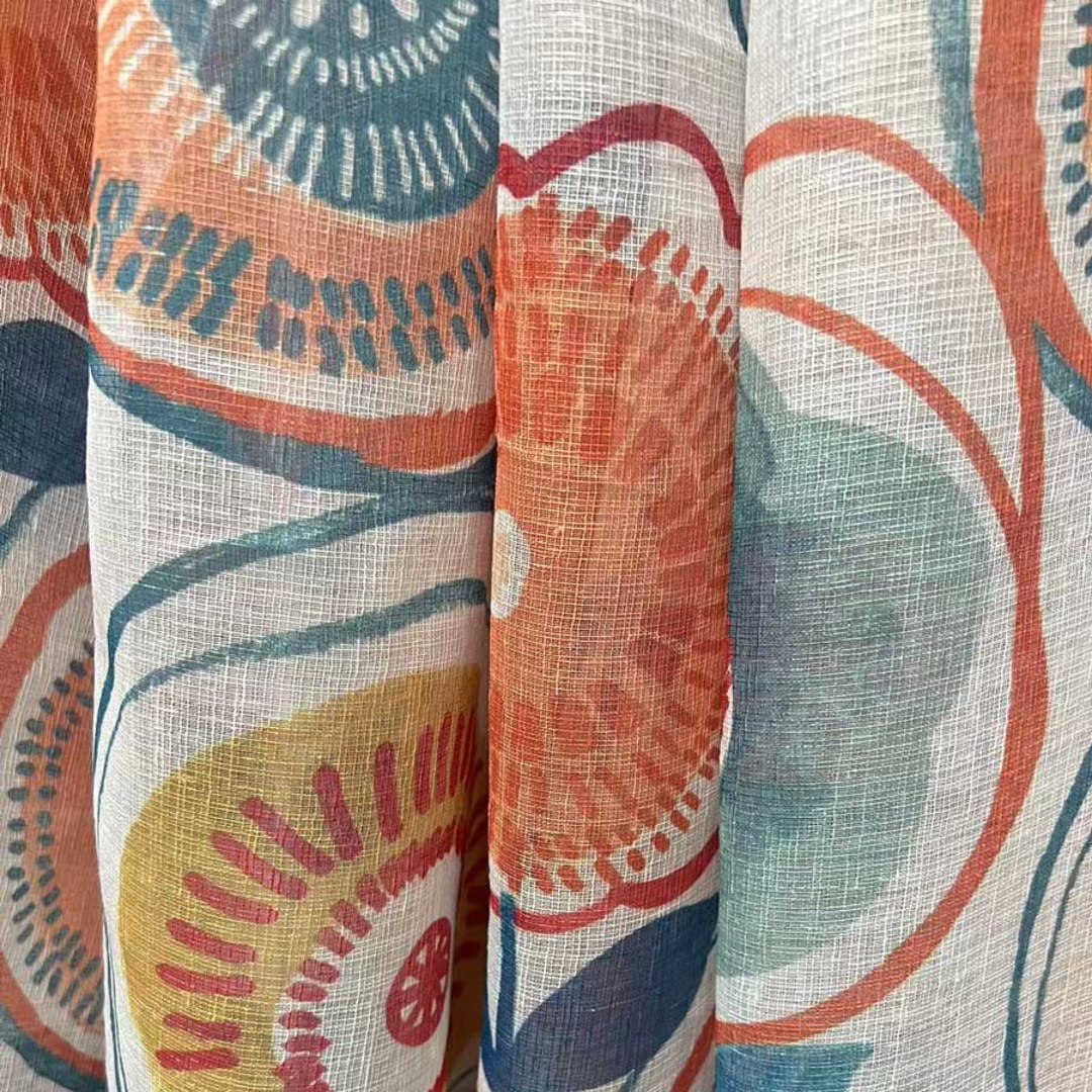 A playful multicolor sheer curtain featuring red, yellow, and blue stylized florals arranged in a rhythmic circle pattern. With its bold palette and graphic design, it brings a lively mid-century modern touch to interiors.
