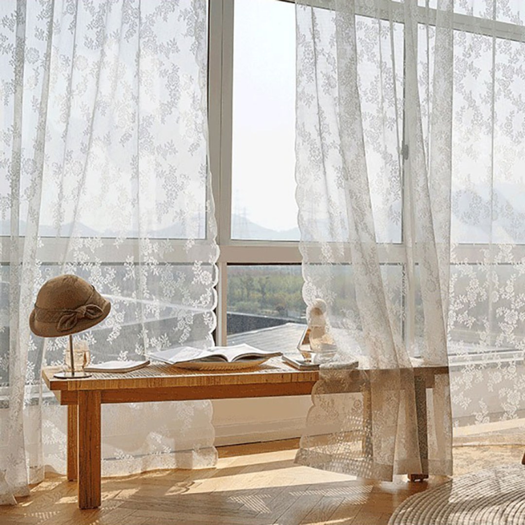 Delicately crafted with an intricate floral lace pattern and finished with a graceful scalloped edge, these sheers bring timeless elegance and soft, romantic charm to any space. Their airy net construction allows natural light to filter gently, while the subtle pastel hue adds a serene, inviting touch.