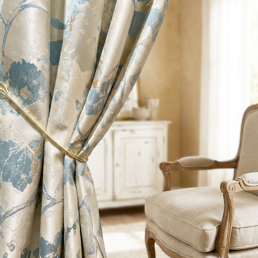 Secret Garden Silky Cream & Pastel Teal Floral Curtain with Gold Details