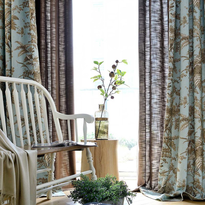 A linen style curtain featuring magpies in flight and lush ferns in a vintage blue and brown palette. Adds French country, rustic elegance to any room.