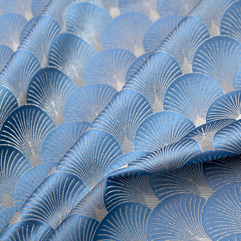 These classic Art Deco shell patterned aqua blue and silver curtains will complement any room of your choice and serve as a bold feature of decor.