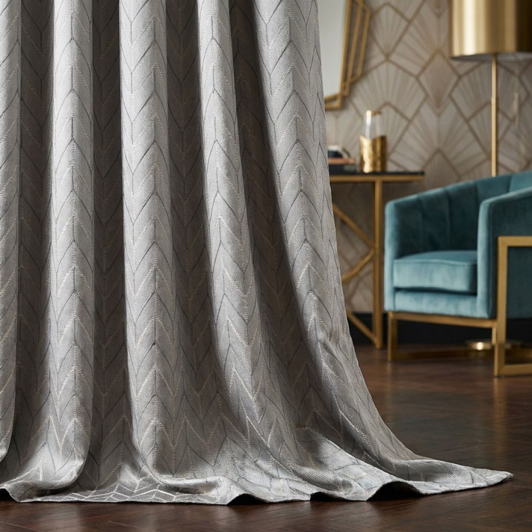 Savour the luxurious allure of our Art Deco chevron patterned curtains, a seamless fusion of modern sophistication and timeless elegance. Immerse yourself in the exquisite beauty of these curtains, where the intricate chevron pattern effortlessly radiates both opulence and contemporary flair.