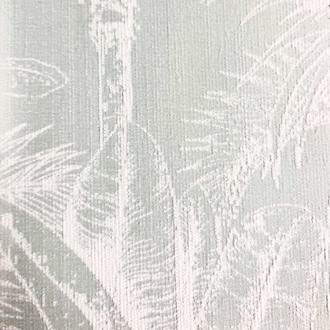 This chenille curtain fabric features a subtle tropical-inspired design with palm fronds and leaves woven into a textured jacquard pattern. The soft green tone is complemented by a raised white design, creating a sophisticated and calming look suitable for a variety of interior styles. The fabric is durable, making it ideal for window treatments, adding both style and a touch of nature to any space.