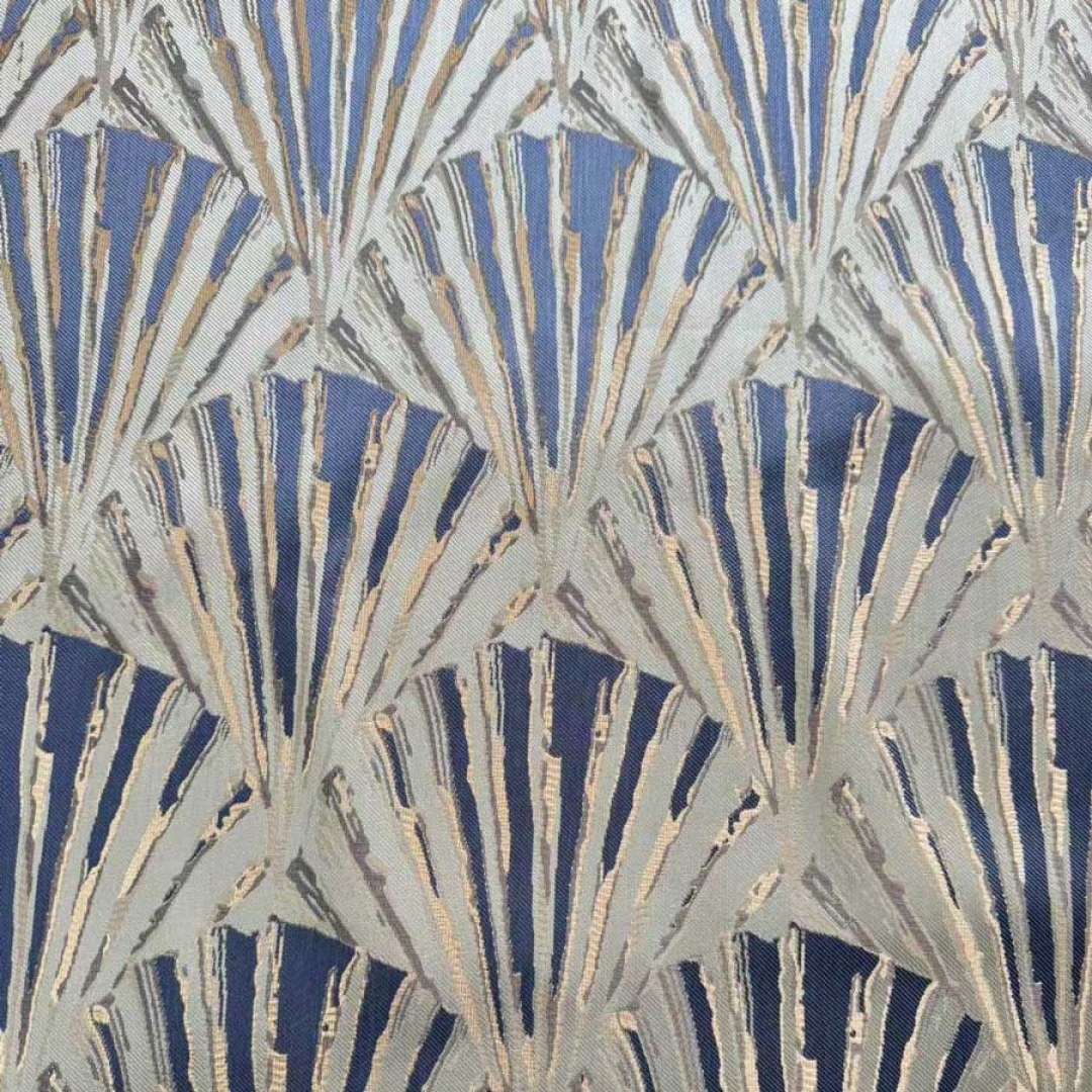 These luxurious curtains unfold a dance of stylized fans, their overlapping arcs in blue and gold creating a harmonious rhythm.