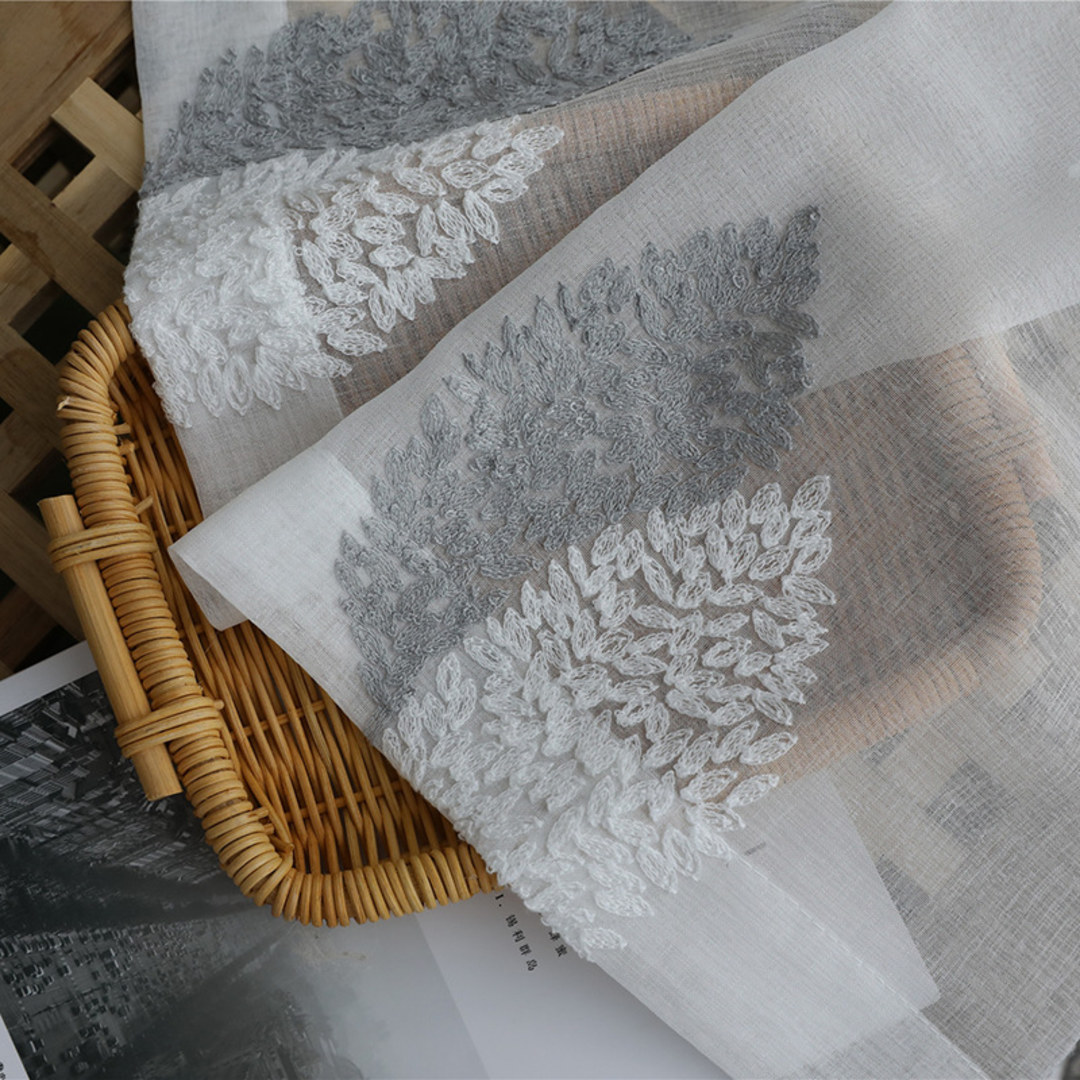 Wake up feeling relaxed with these stunning embroidered gray and white banyan leaves voile curtains.