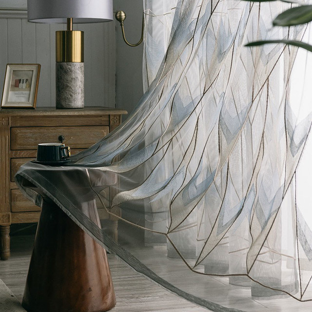Pared-back living spaces can be calm havens. Try a subtle way to give your home a modern and sophisticated look with these custom geometric grey sheer curtains.
