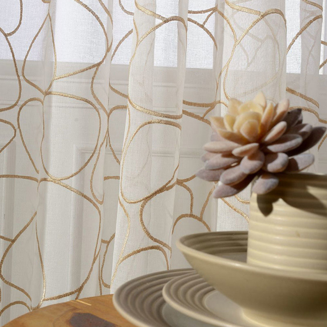 Try a subtle way to give your home a modern and sophisticated look with these embroidered gold circles sheer curtains.