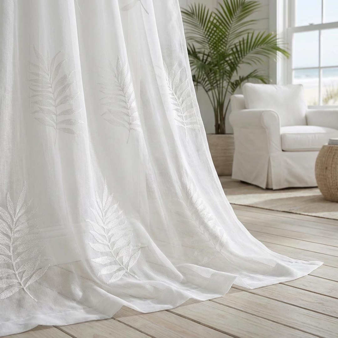 Introducing our Leafy Whispers Embroidered Ivory White Sheer Curtain—a delicate masterpiece. The intricate leafy embroidery dances gracefully on soft ivory-white voile fabric, creating a natural elegance. As sunlight gently filters through, a play of shadows and light enhances the ethereal pattern. The subtle detailing of embroidered leaves adds a whimsical and enchanting touch. Elevate your space with simplicity and sophistication.