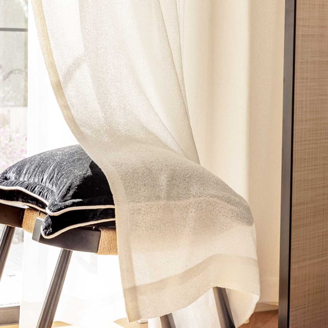 Timeless elegance in every detail. This heavy voile curtain in soft beige and cream features a subtle, textured weave reminiscent of the iconic tweed of a Coco Chanel suit. Its refined, sophisticated surface allows light to filter softly while maintaining privacy, making it a perfect choice for contemporary interiors that value understated luxury and classic style.