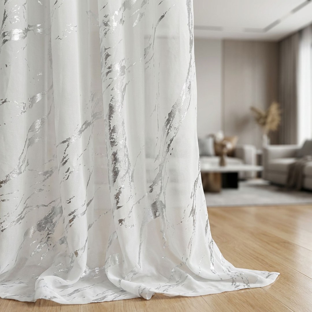 Lunar Marble Abstract White and Silver Sheer Curtains 20% OFF