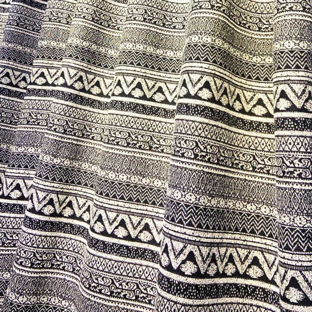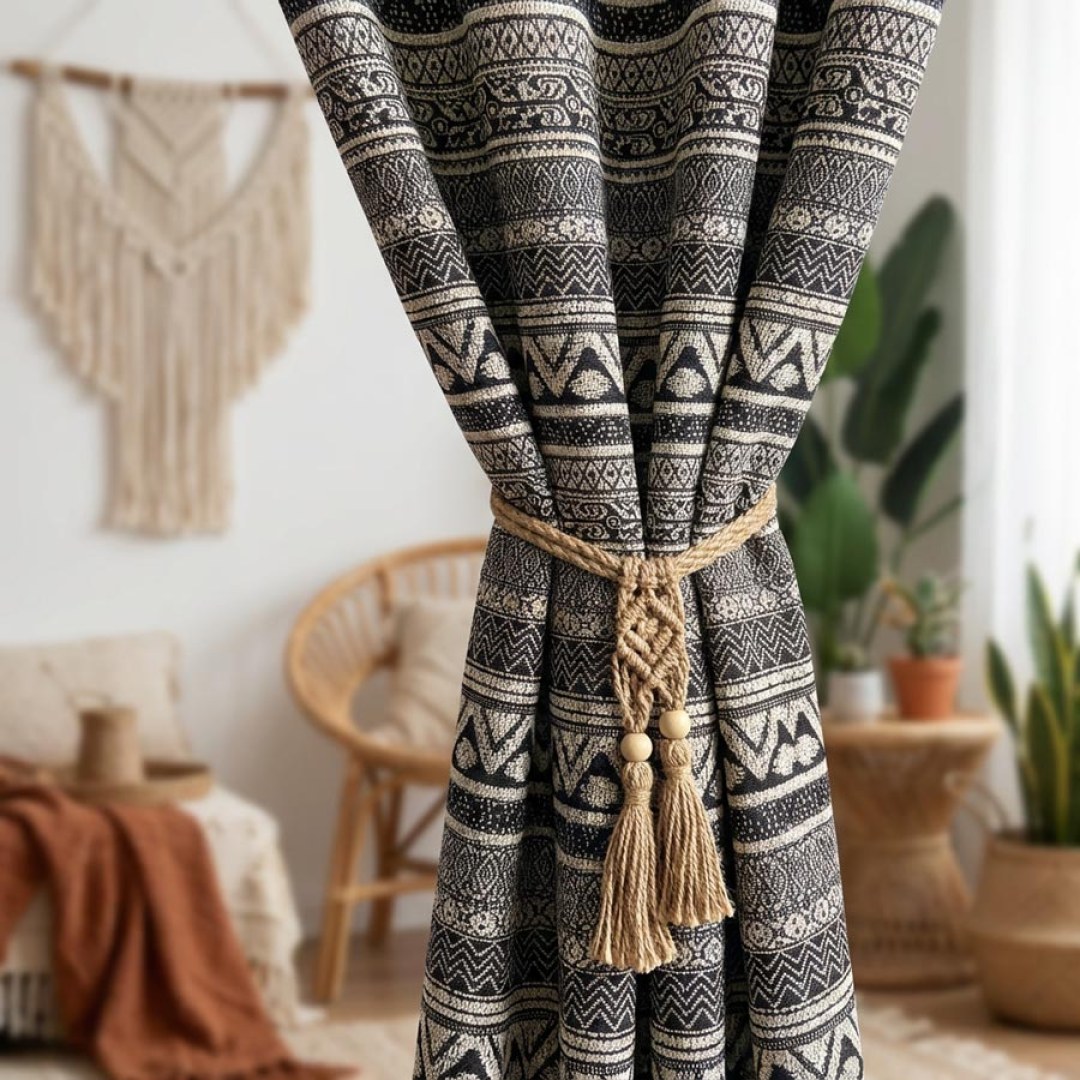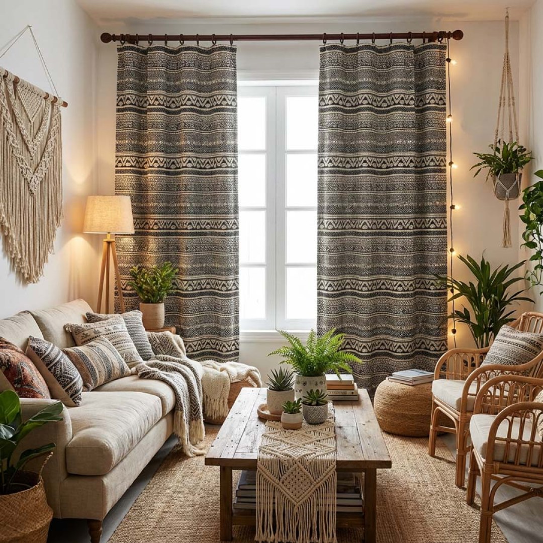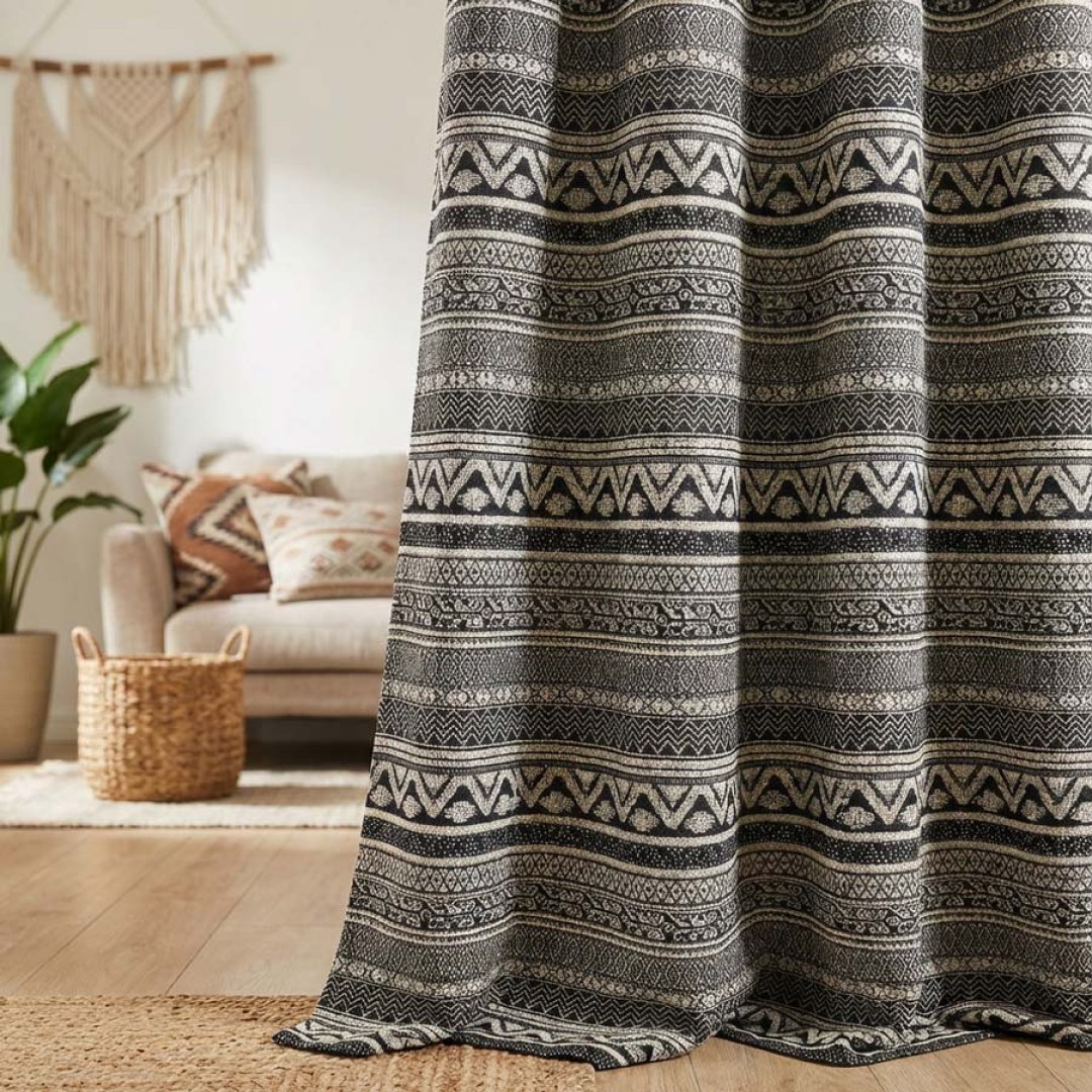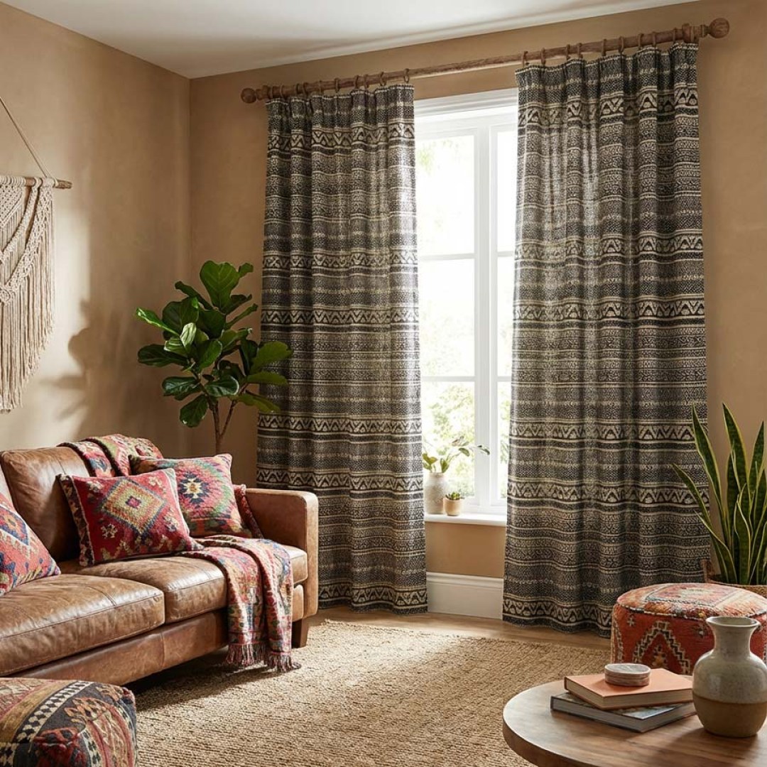 These bohemian style curtains create a characterful room by its intricating geometric patterns and horizontal stripes.