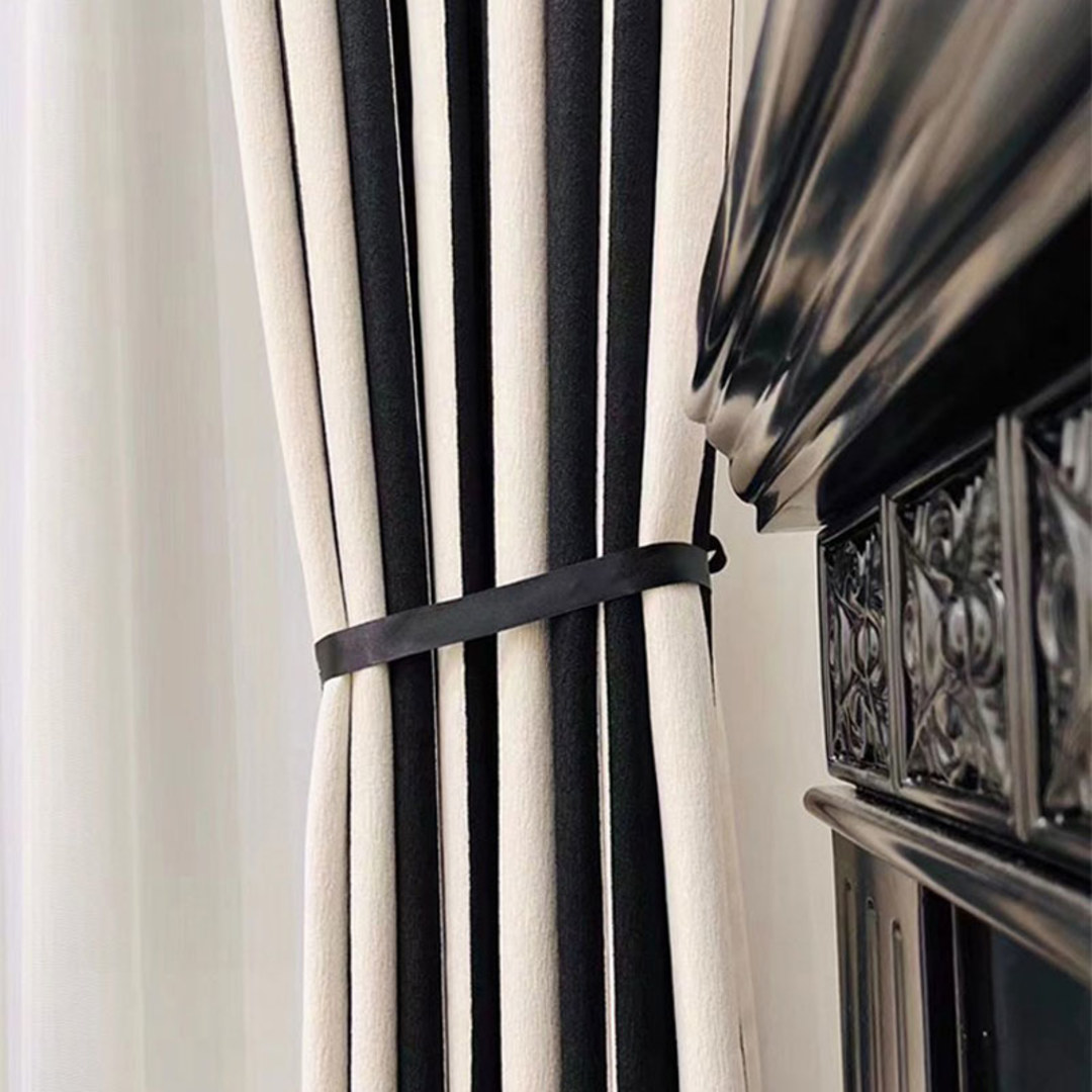 This double-sided chenille curtain features bold black and white stripes and a plush texture, adding modern flair and luxurious comfort to contemporary interiors.