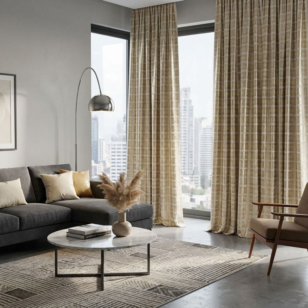 Palais Aurum Cream Gold Checked Plaid Curtains