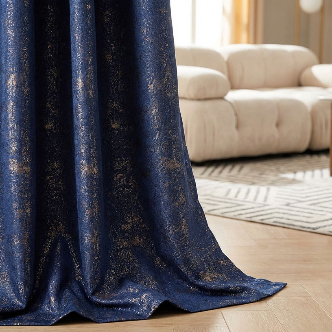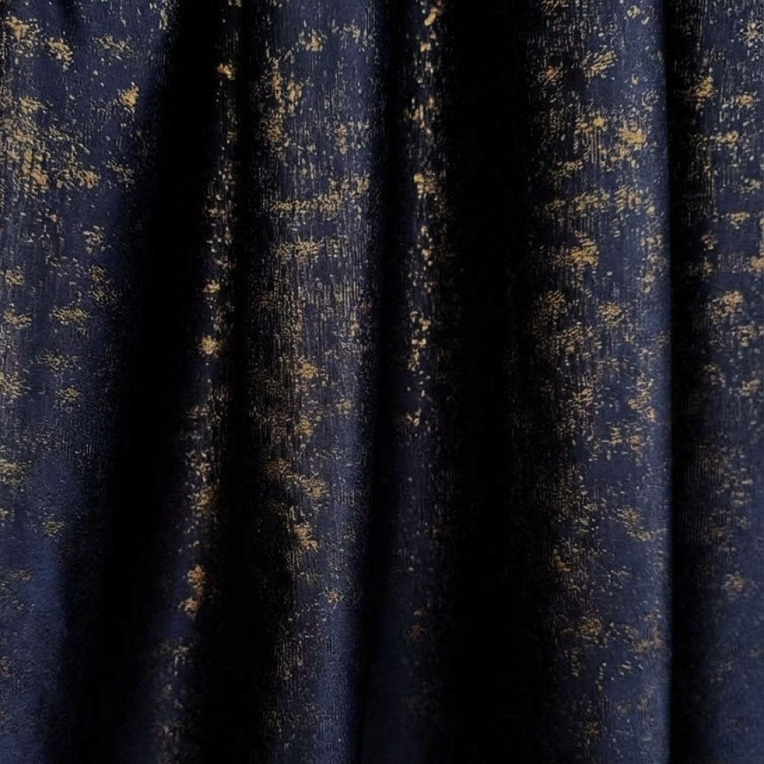 Inspired by the mesmerizing depths of interstellar space, this sumptuous jacquard curtain features luminous gold speckles scattered across a rich, dark blue canvas.