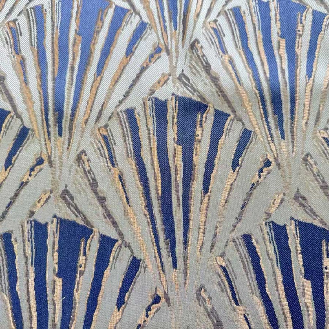These luxurious curtains unfold a dance of stylized fans, their overlapping arcs in blue and gold creating a harmonious rhythm.