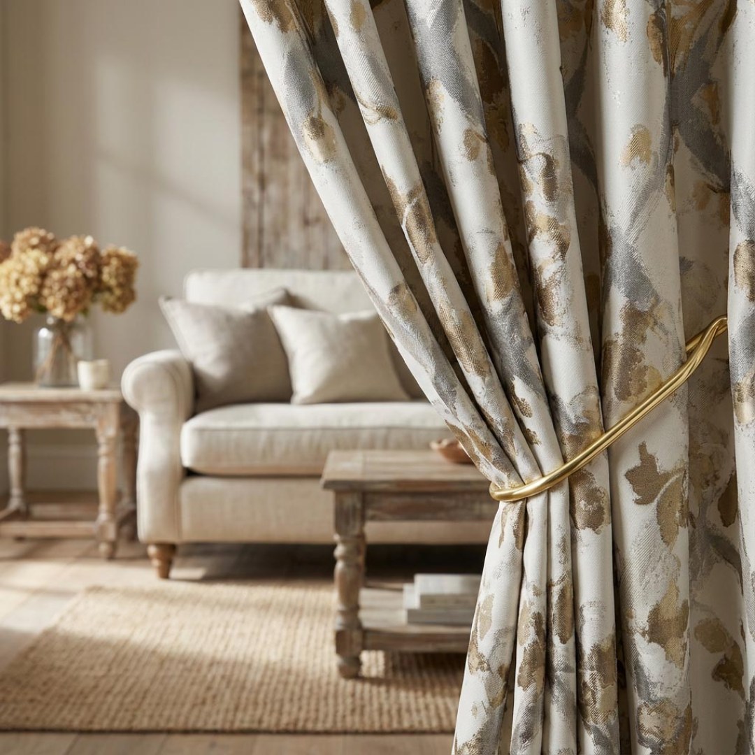 Featuring a delicate lattice pattern interwoven with soft floral accents in muted gold and ivory, this luxurious fabric adds a touch of timeless sophistication to any room. Perfect for creating a warm, inviting ambiance, it’s ideal for both modern and classic interiors.