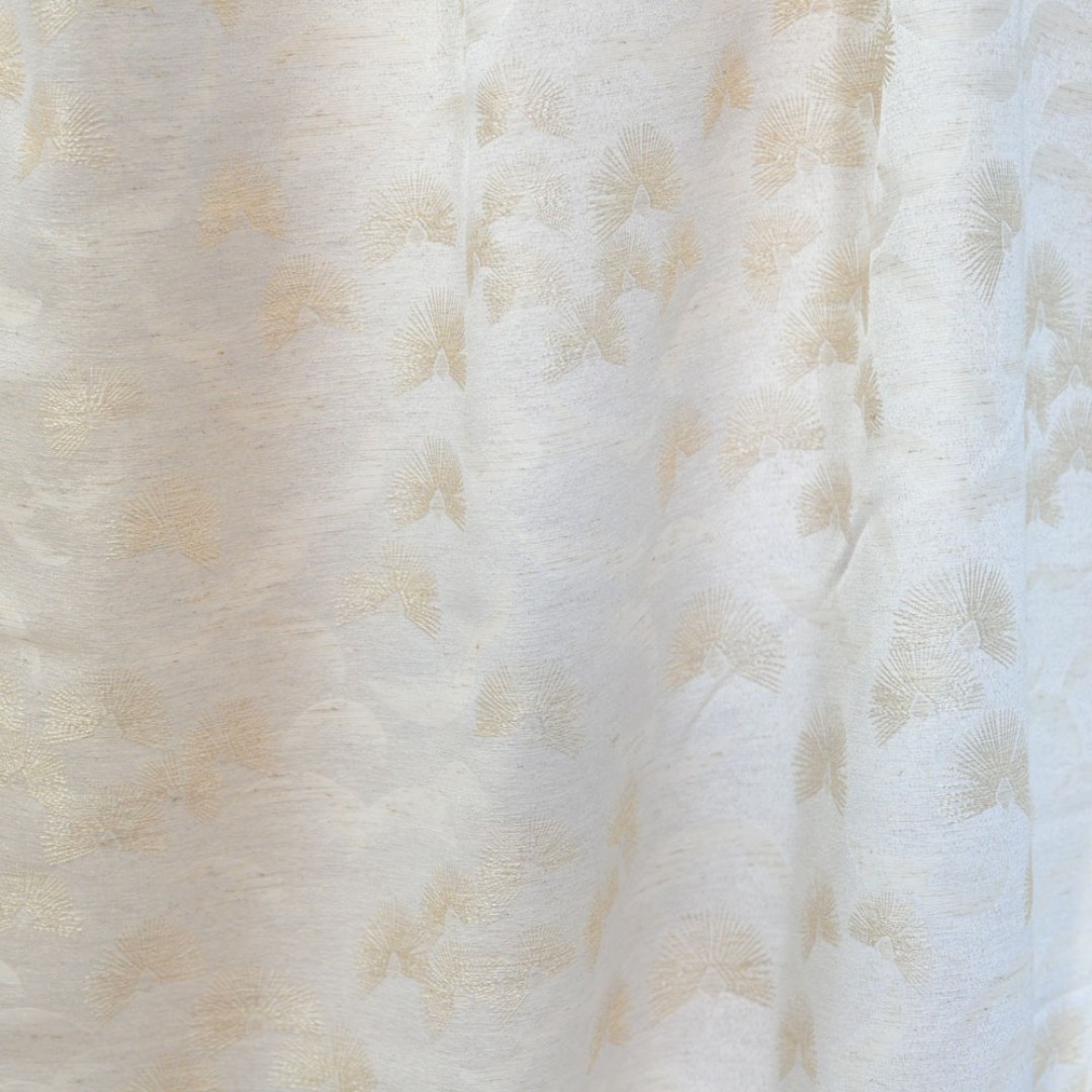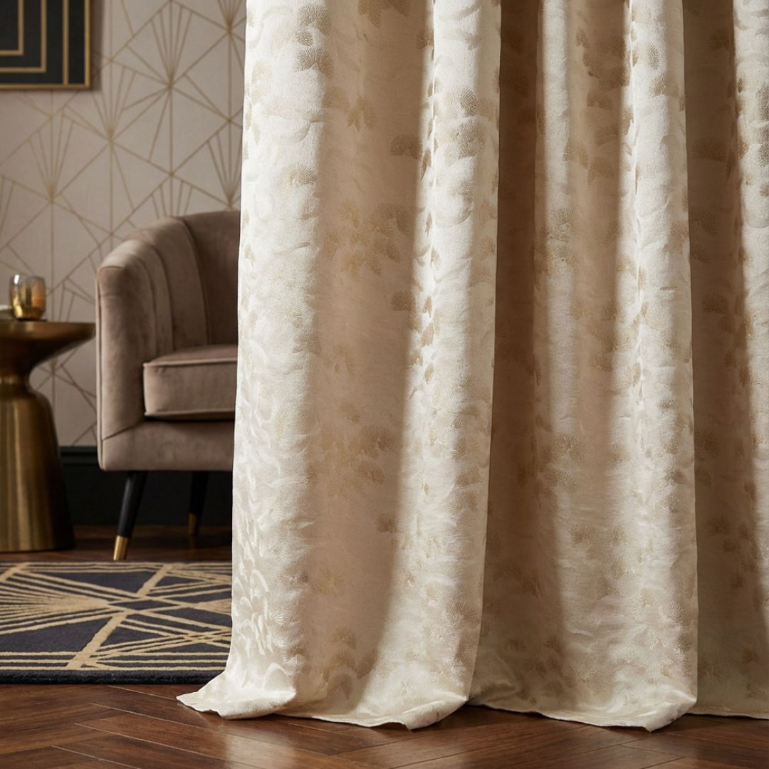 This curtain features an Art Deco influenced fan motif blended with Asian-inspired grace, creating a refined balance of geometry and soft movement. The textured jacquard pattern adds depth and sophistication, ideal for curated interiors seeking calm elegance with a hint of global design heritage.