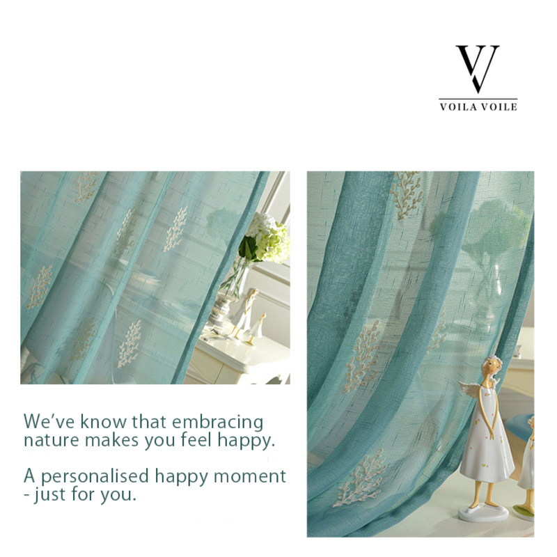 Trees of the Four Seasons Teal Blue Embroidered Sheer Voile Curtain